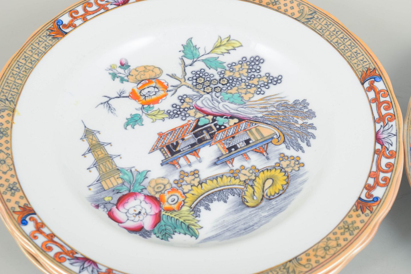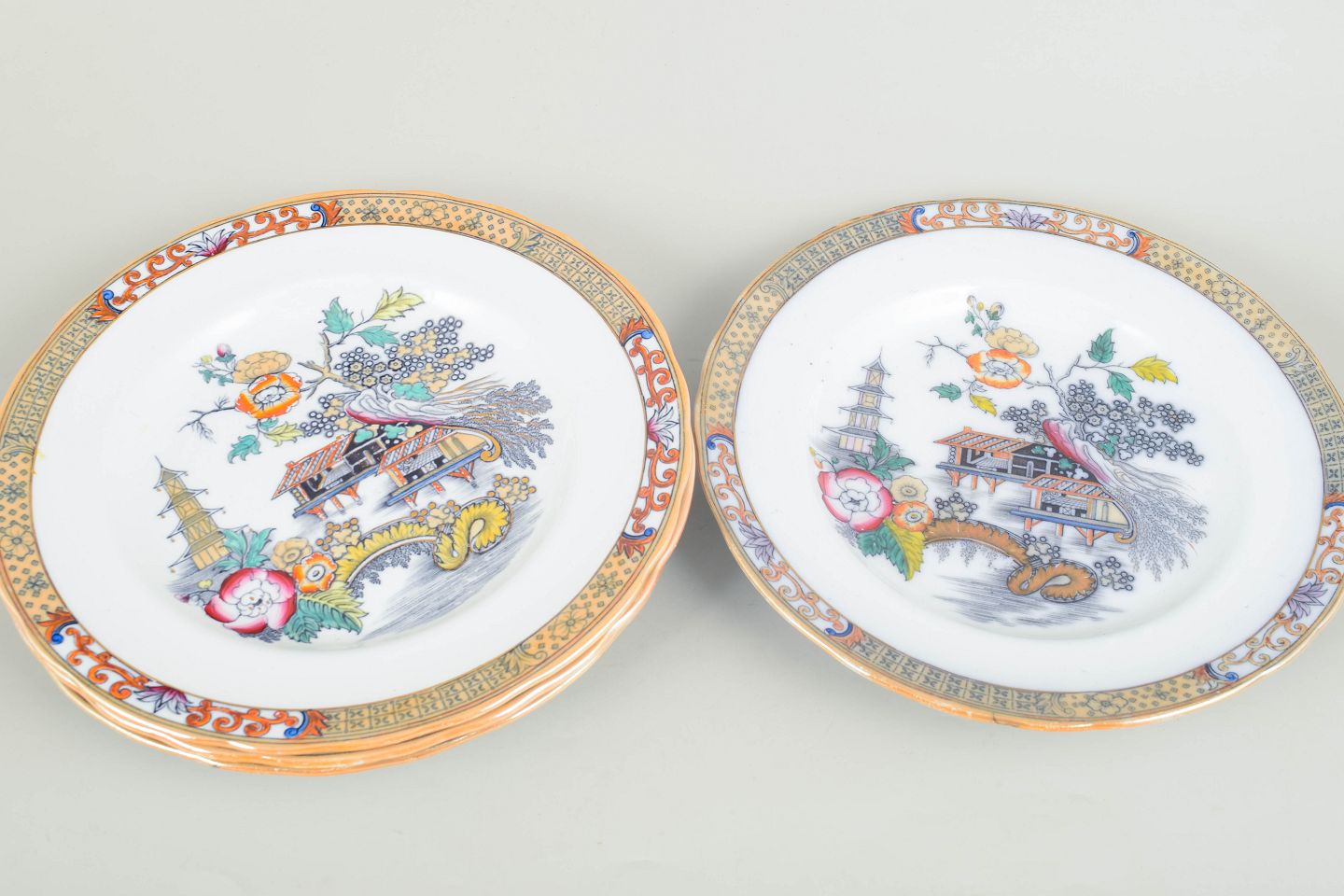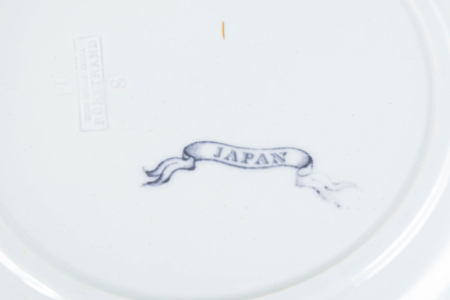 Rörstrand "Japan", sæt af fire middagstallerkener.Middagstallerkener i fajance med orientalsk inspireret dekoration i polykrome farver og detaljerig bemaling i japansk stil, karakteristisk for Rörstrands japanismeproduktion fra begyndelsen af 1900-tallet.