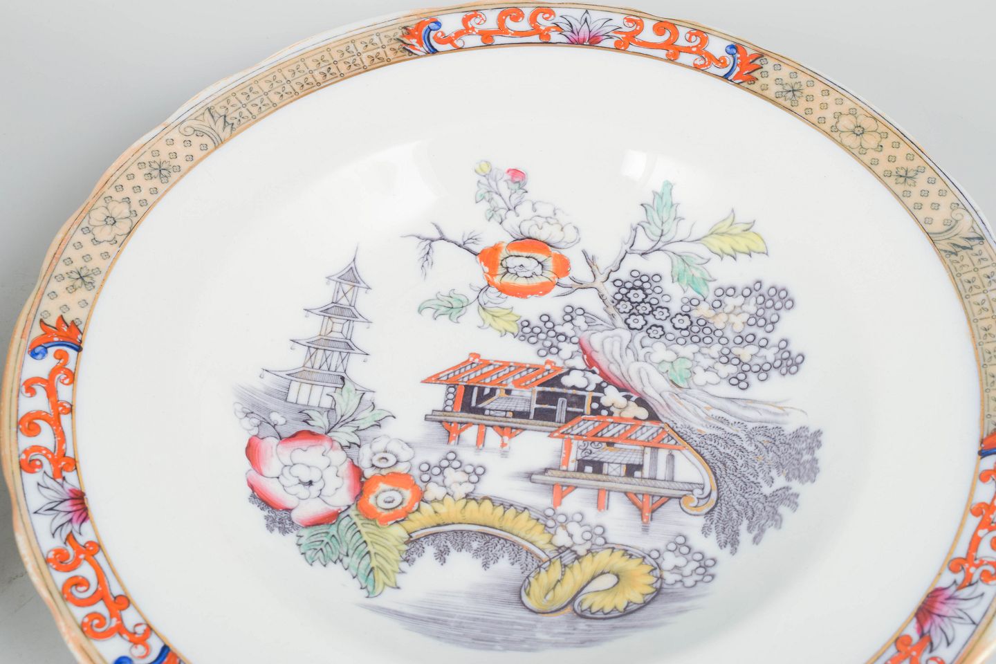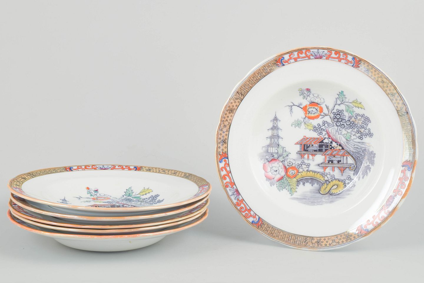 Rörstrand "Japan", sæt af seks dybe tallerkener.Dybe tallerkener i fajance med orientalsk inspireret dekoration i polykrome farver og detaljerig bemaling i japansk stil, karakteristisk for Rörstrands japanismeproduktion fra begyndelsen af 1900-tallet.