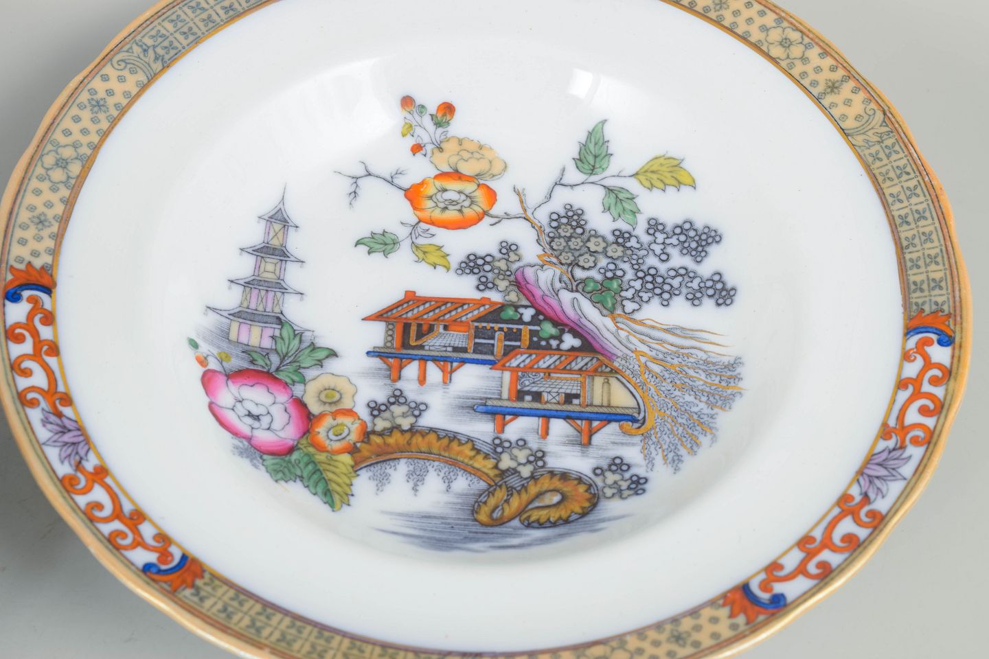 Rörstrand "Japan", sæt af seks dybe tallerkener.Dybe tallerkener i fajance med orientalsk inspireret dekoration i polykrome farver og detaljerig bemaling i japansk stil, karakteristisk for Rörstrands japanismeproduktion fra begyndelsen af 1900-tallet.