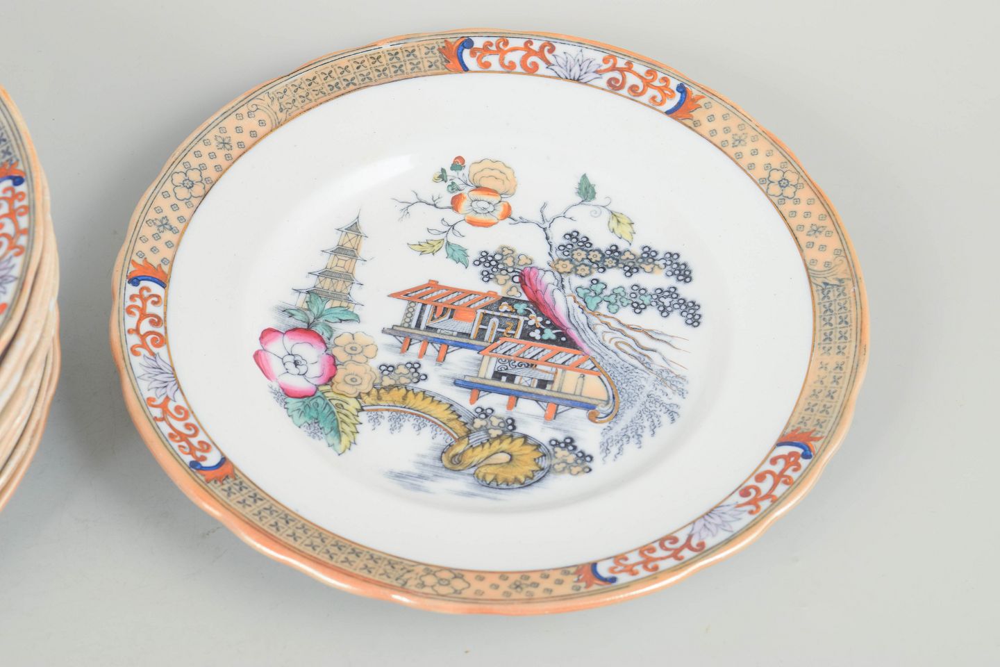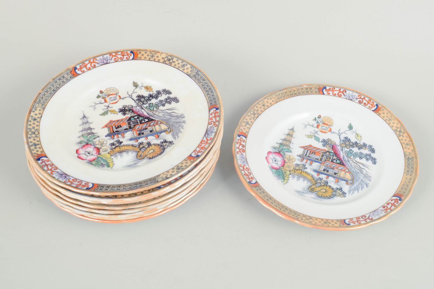 Rörstrand "Japan", sæt af ni frokosttallerkener.Frokosttallerkener i fajance med orientalsk inspireret dekoration i polykrome farver og detaljerig bemaling i japansk stil, karakteristisk for Rörstrands japanismeproduktion fra begyndelsen af 1900-tallet.
