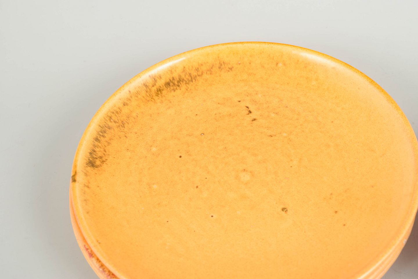 Kähler, sæt af seks tallerkener.Seks keramiske tallerkener med uranholdig glasur i varme gyldne toner, fremstillet hos Kähler i 1930’erne.
