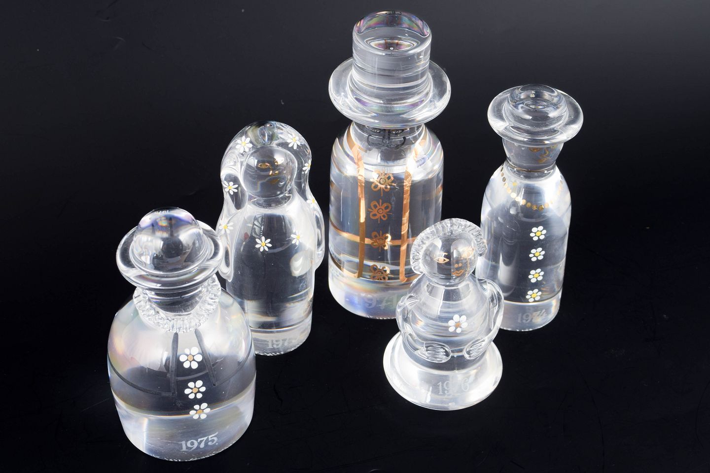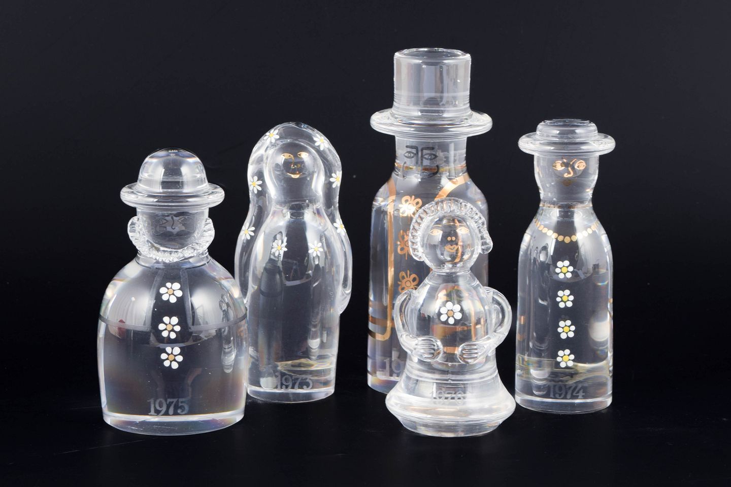 Kosta Boda, sæt af fem “Family” glasfigurer.Håndlavede kunstglasfigurer i klart glas med enkle, stiliserede former og dekorative hvide og gyldne blomstermotiver, der repræsenterer en familiegruppe.