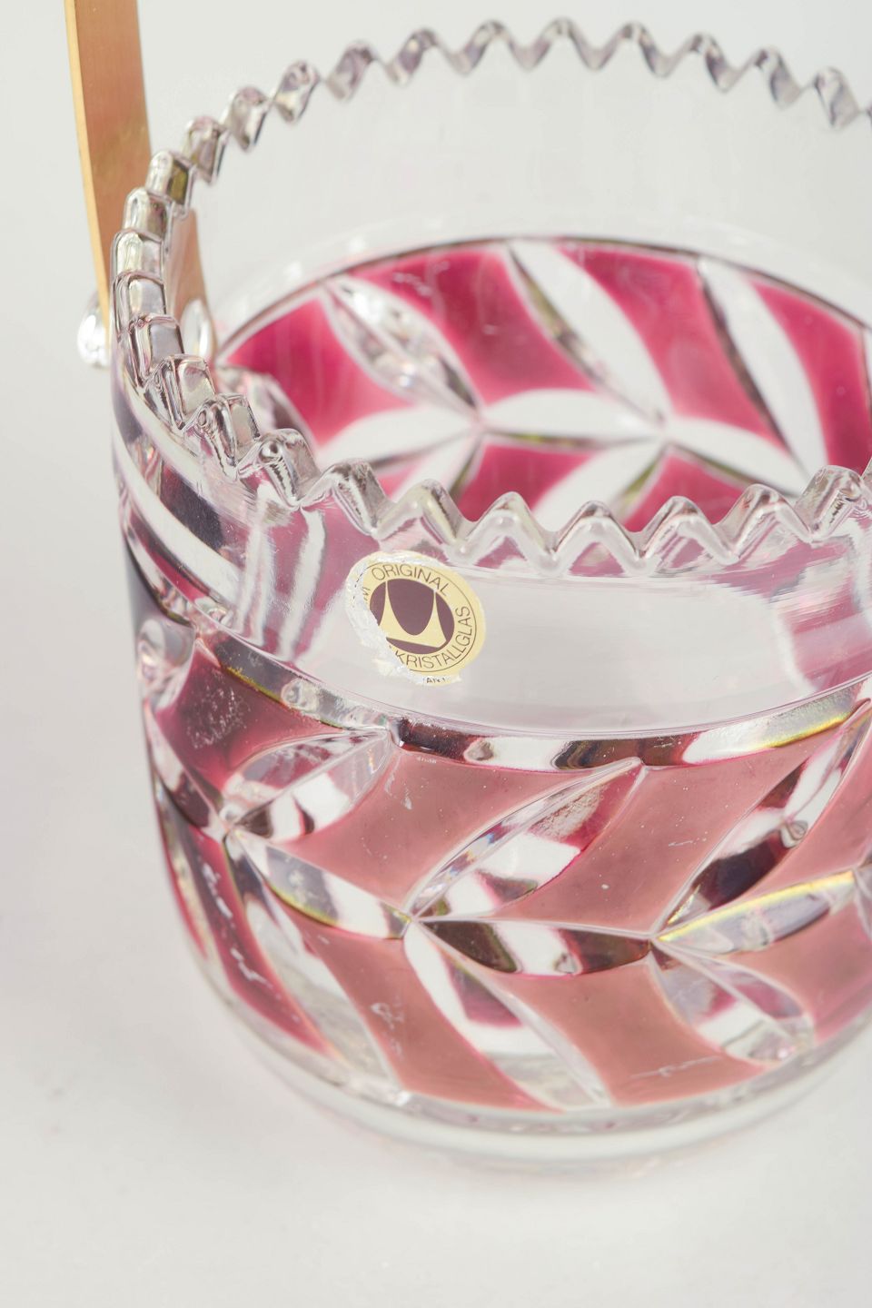Bøhmisk krystalglas, isspand.Presset og slebet krystal i klart og rosa tonet glas med geometrisk slebet mønster, med håndtag i messing og original mærkat.