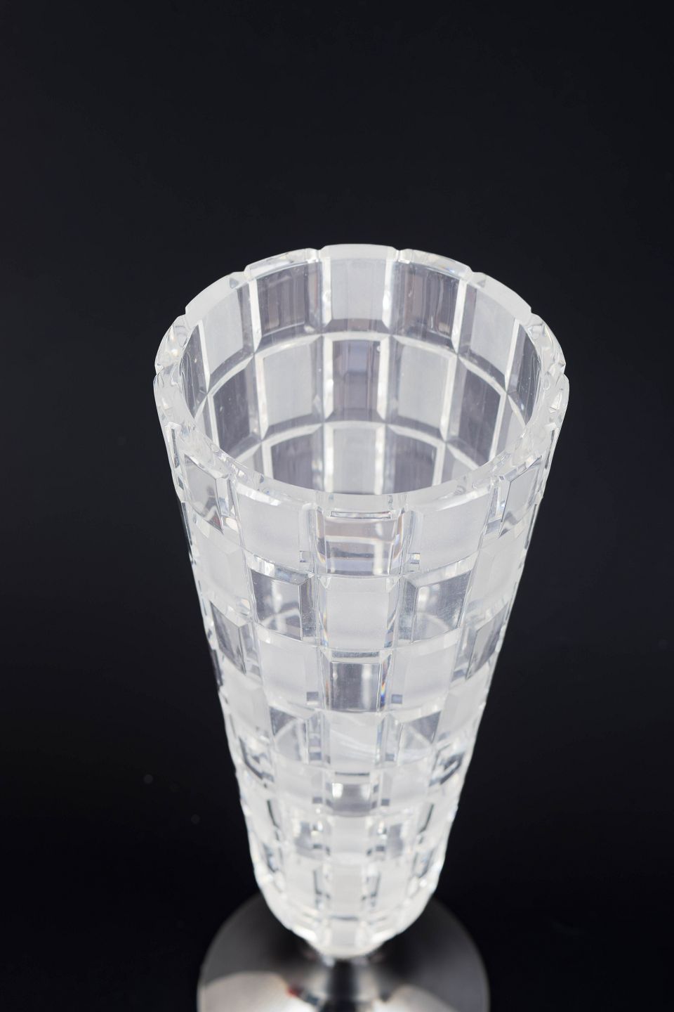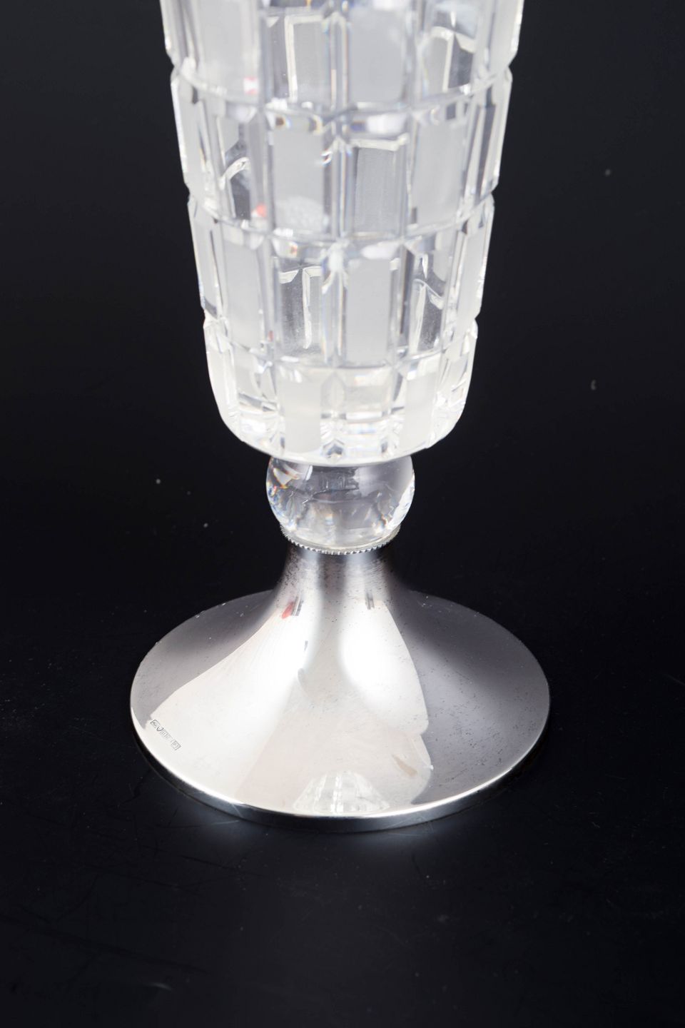 Aimo Okkolin for Riihimäen Lasi, “Ruuta” vase.Modernistisk vase i slebet krystal med geometrisk mønster og fod i 813 sølv. Designet fremstår med klar, arkitektonisk struktur typisk for finsk glasdesign fra perioden.
