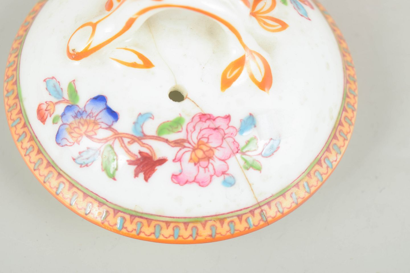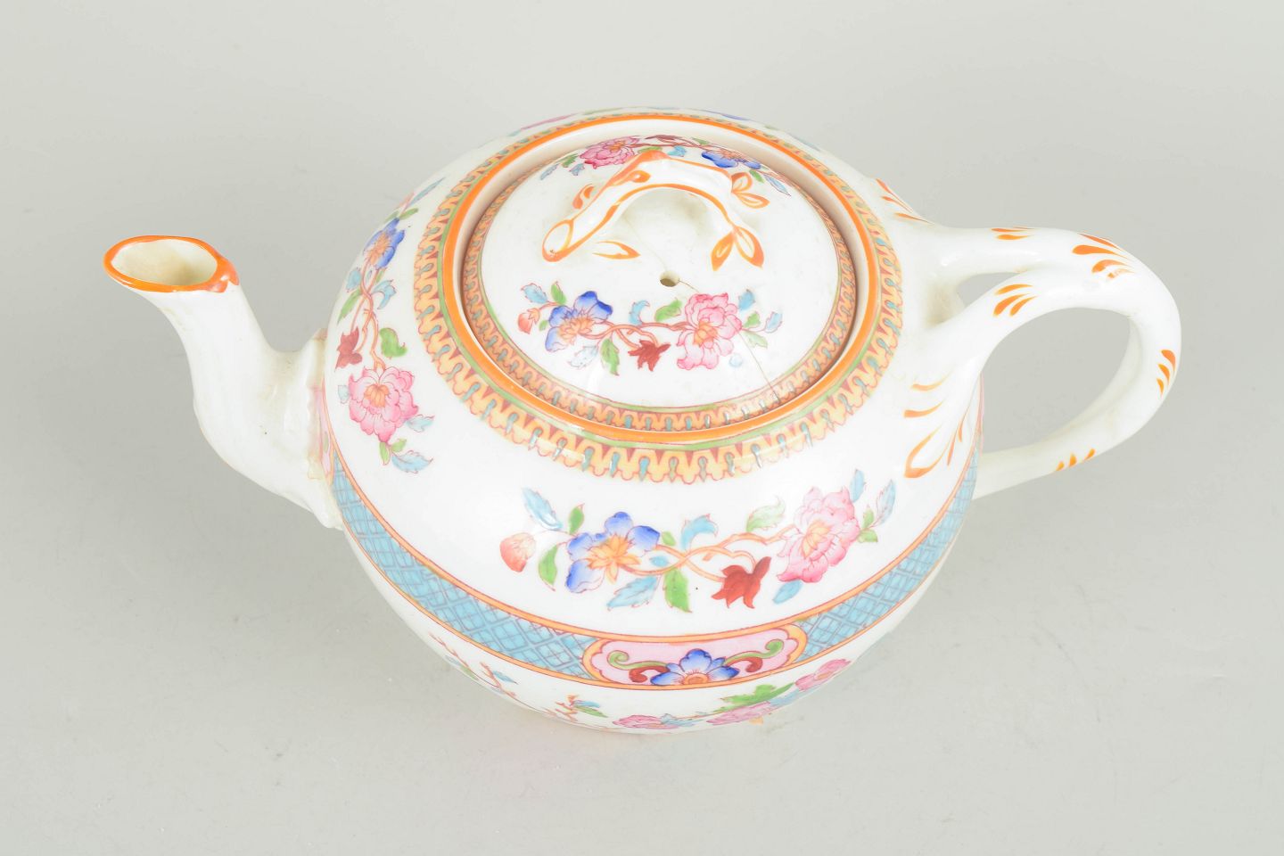 Cauldon China England, tekande i porcelæn.Dekoreret med polykrome blomster i orientalsk inspireret stil samt kantbort i turkis og guld. Låg med finial og buet hank, mærket under bunden.