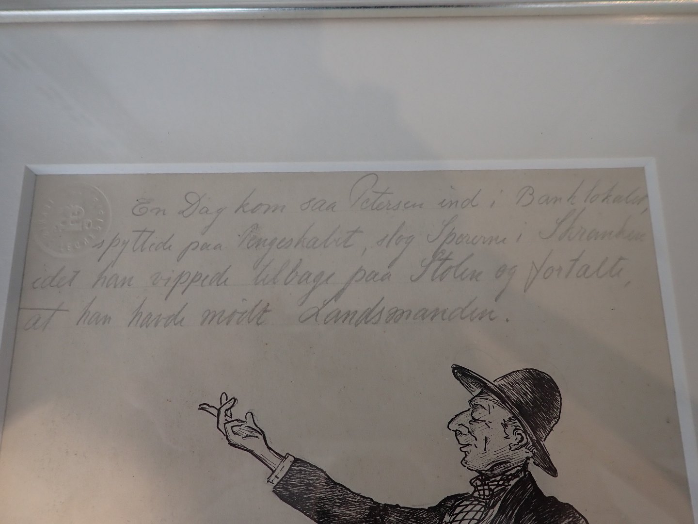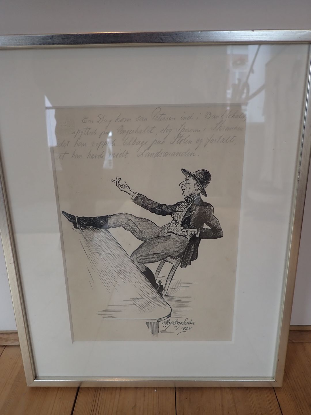 Indrammet original signeret Kaj Engholm 1924 (1906 - 1988) - tush tegning med hans egen blyantstekst: "En Dag kom saa Petersen ind i Banken, spyttede på Pengeskabet, slog Sporerne i Skranken idet han vippede tilbage paa Stolen og fortalte, at han havde mødt Landsmanden". Størrelse:17,5 x 24,5. I fin stand. Udstiller
