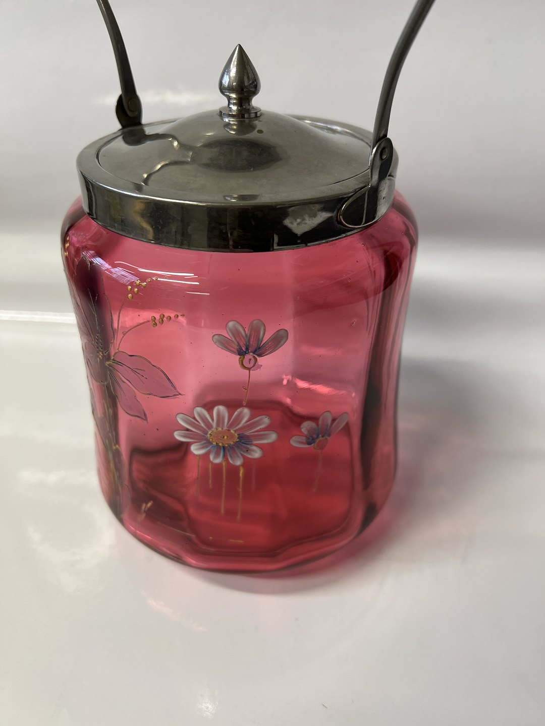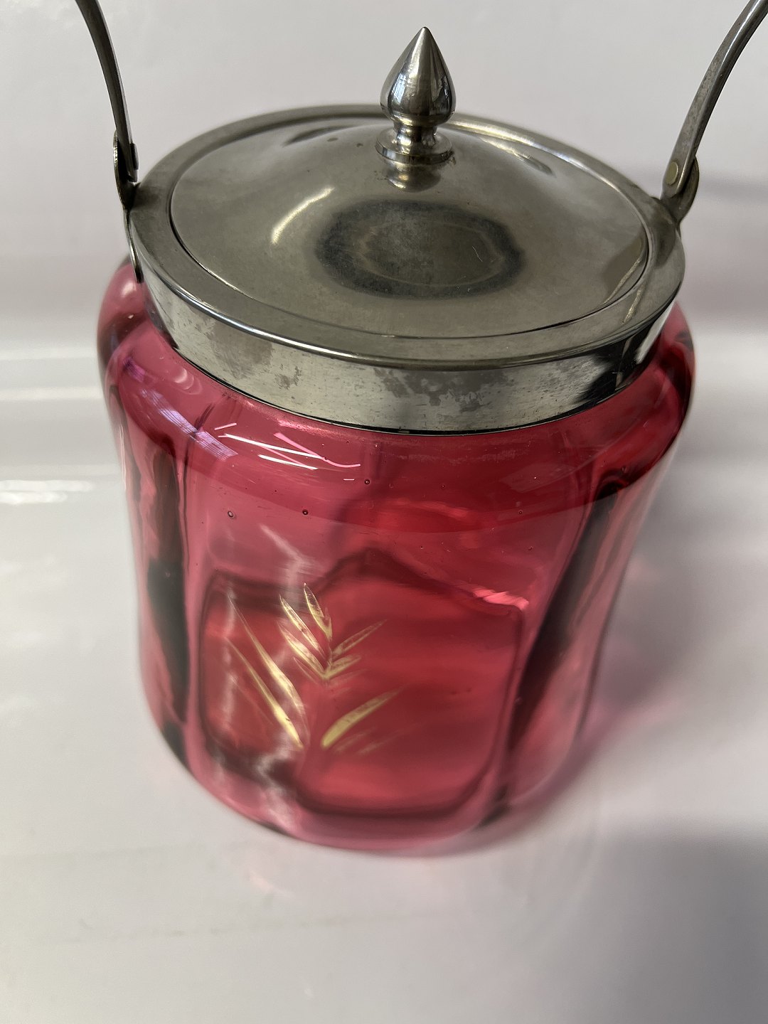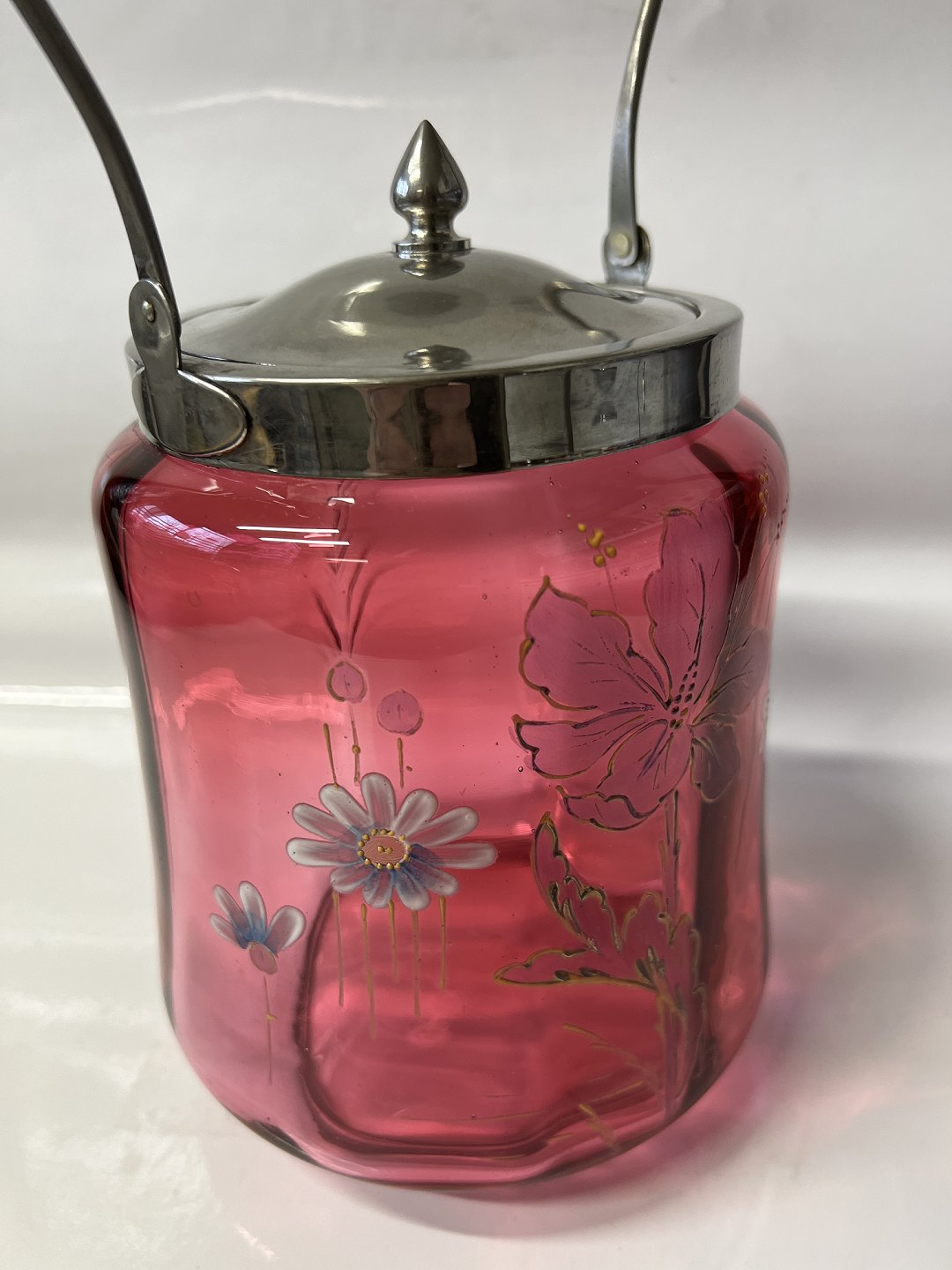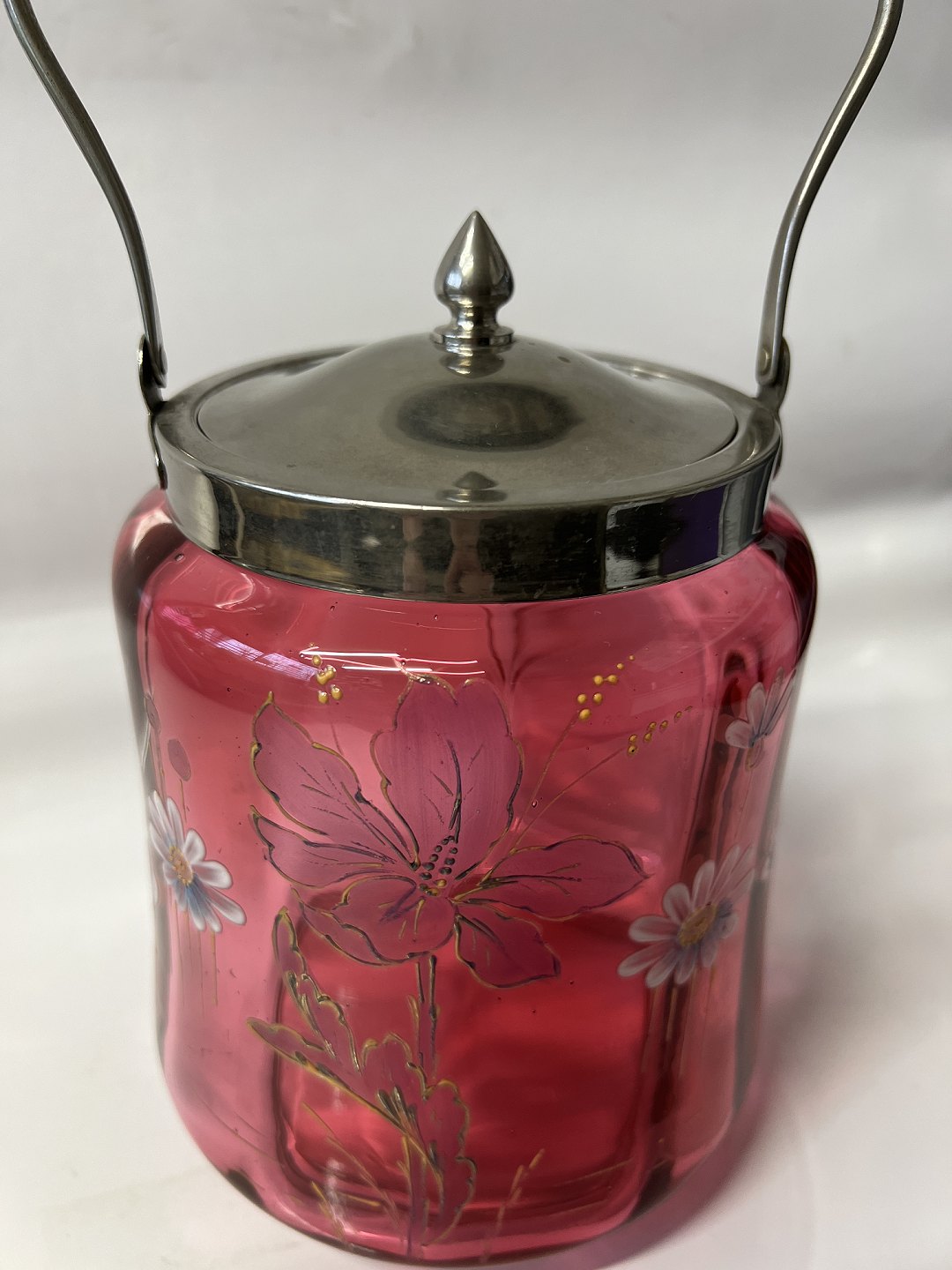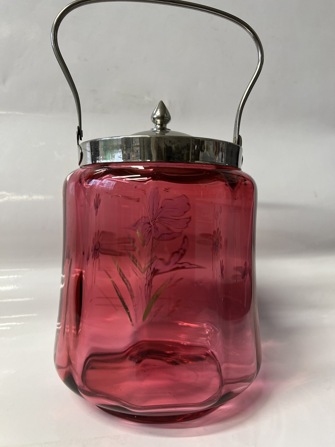 Kiksespand i Rød Glas med blomstermotiv.Højde med hank 26,5 cm.