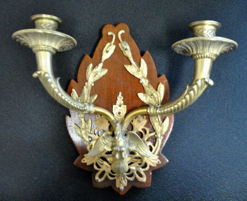 Par franske bronze dobbelte vægstager, monteret på træ, 19. årh. Dekoration i form af svaner med udspredte vinger. H. 23 cm. B. 27,5 cm.Kan monteres til el. Perfekt stand!