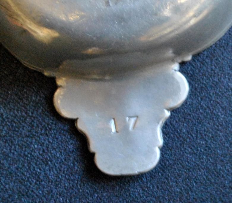 Barok øre skål i tin. 18. årh. Danmark. Madskål. Med glatte, buede sider. Støvte ører med barokmønstre. På undersiden af det ene øre, stemplet: 17. Dia: 16 cm. Længde med ører: 24,5 cm. H.: 4 cm. Ingen mesterstempler.Antagelig øreskål fra dansk militærhospital.