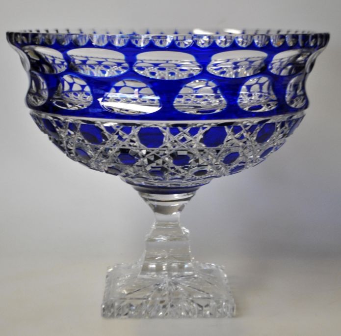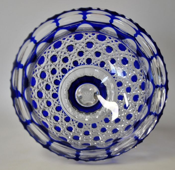 Stor krystalopsats, 20. årh. Med blåt overfang. På firkantet fod. H.: 21 cm. Dia.: 24 cm.Emne nummer: 29048