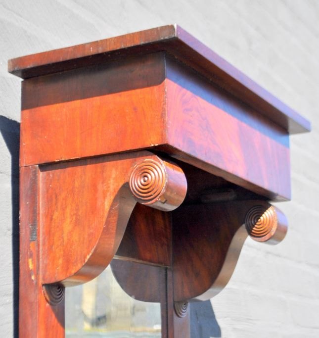Senempire spejlkonsol i mahogni, 19. årh. Med udskårne volutter. H: 86 cm. B: 41,5 cm. D: 20,5 cm.Emne nummer: 29159
