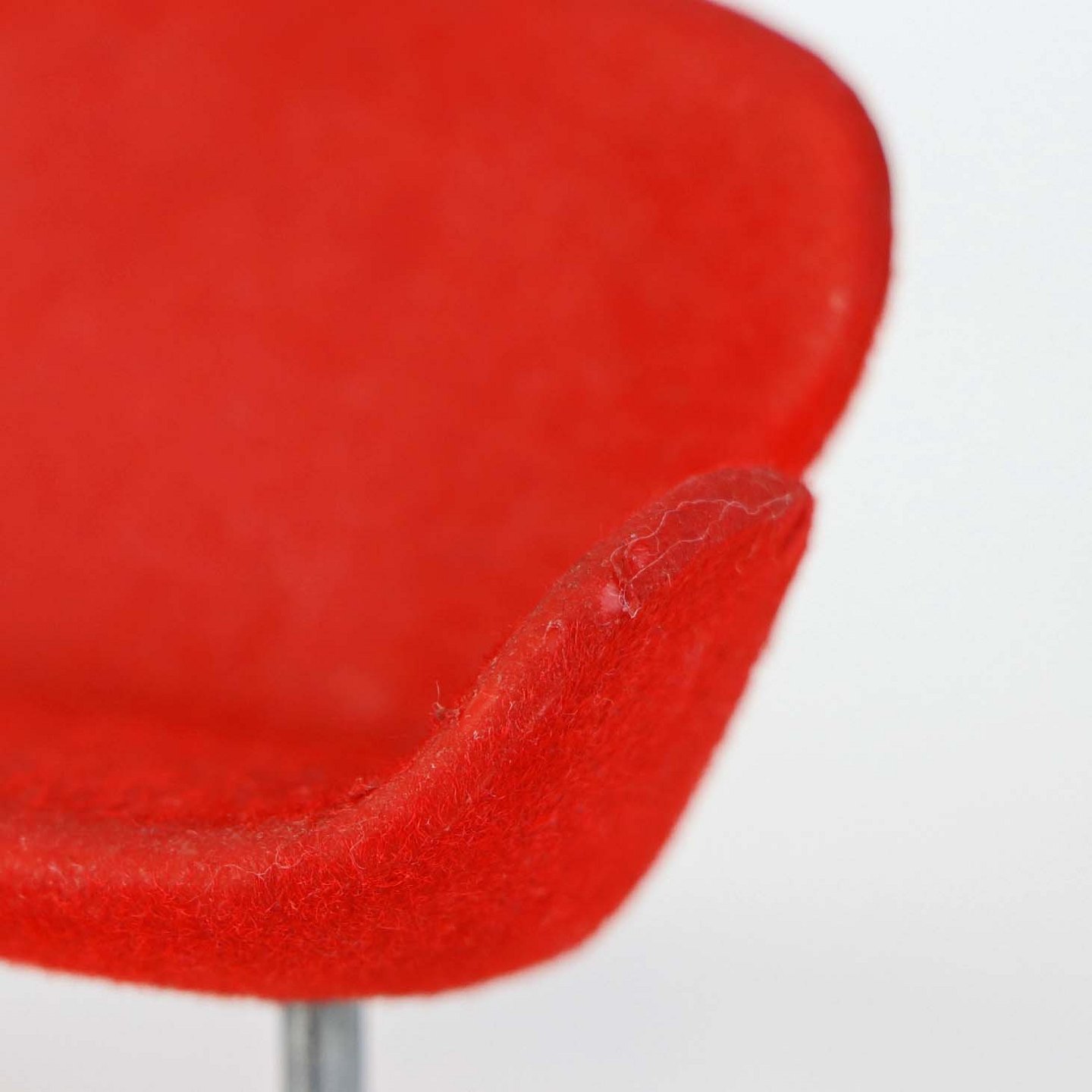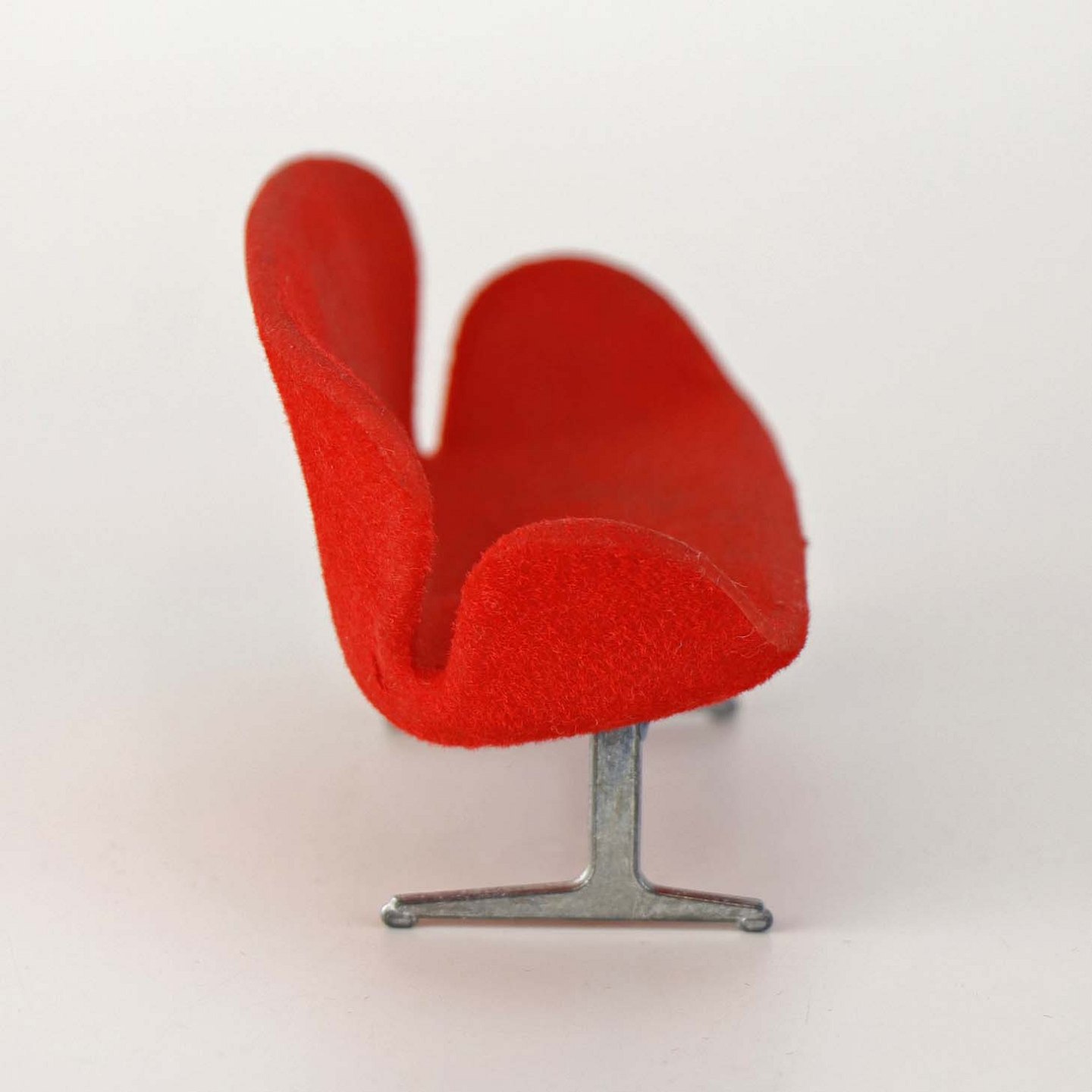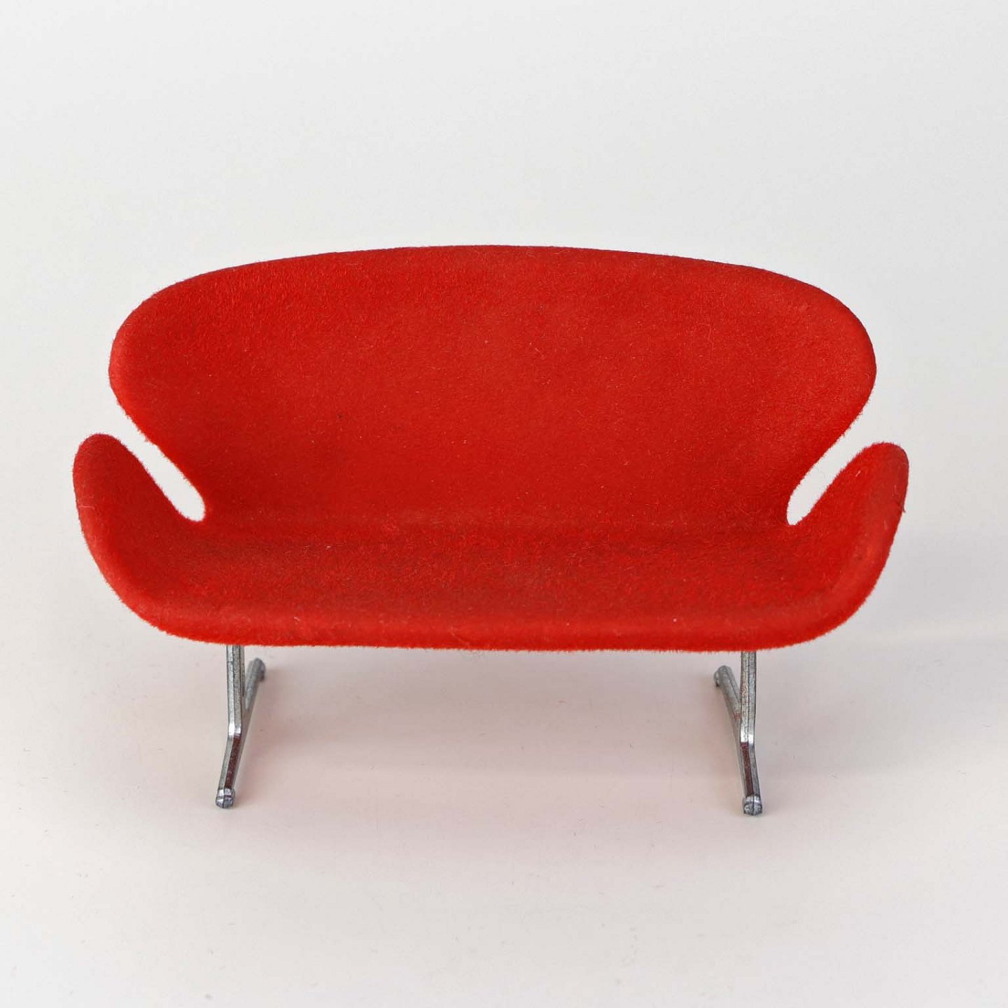 Miniature designermøbel til dukkehus med model af Arne Jacobsen's Svanesofa i rød farve med stel i metal.Design Arne Jacobsen