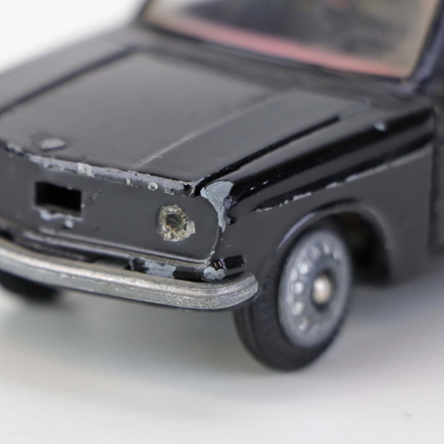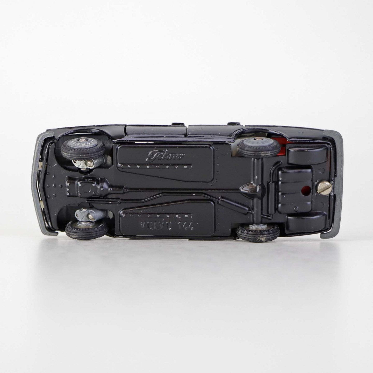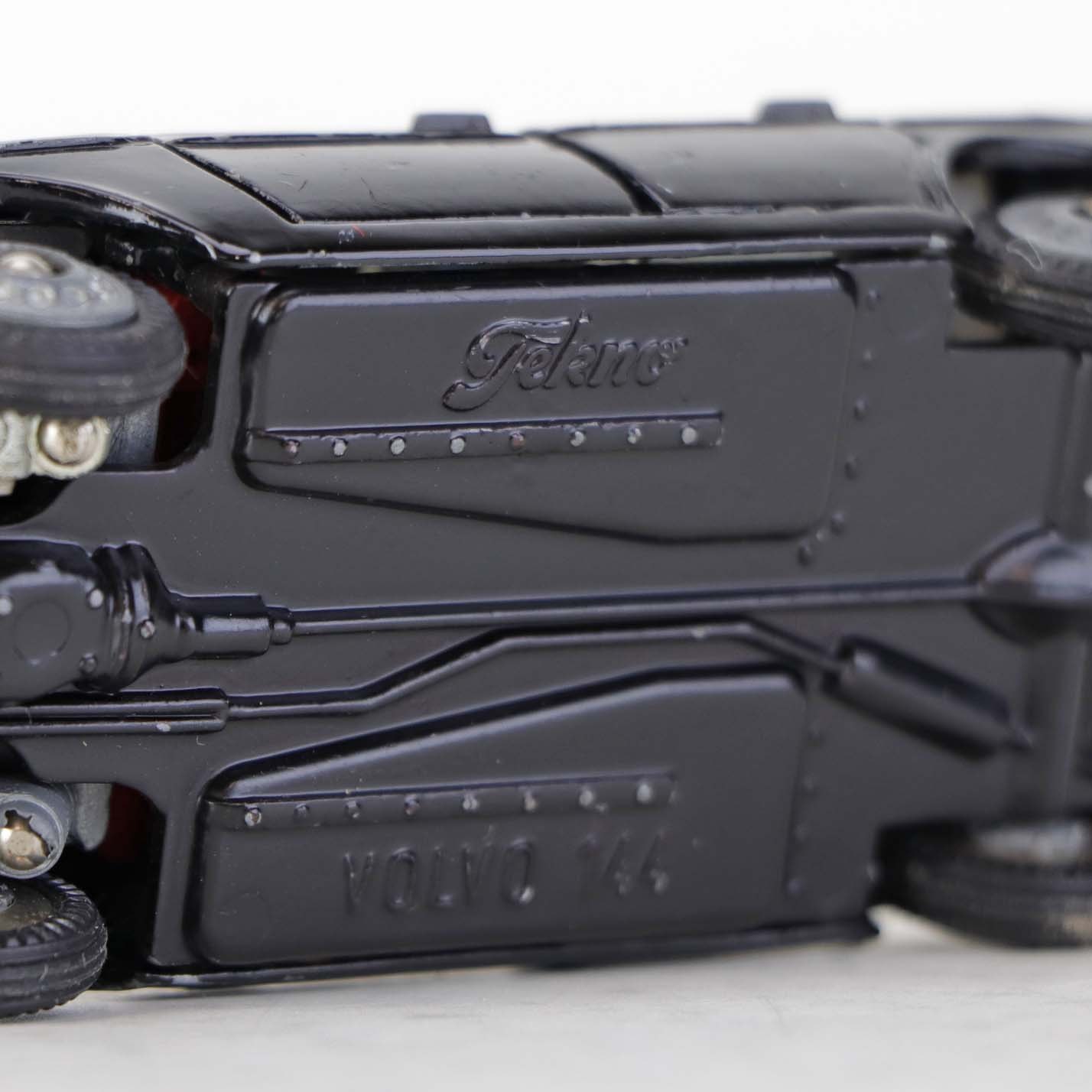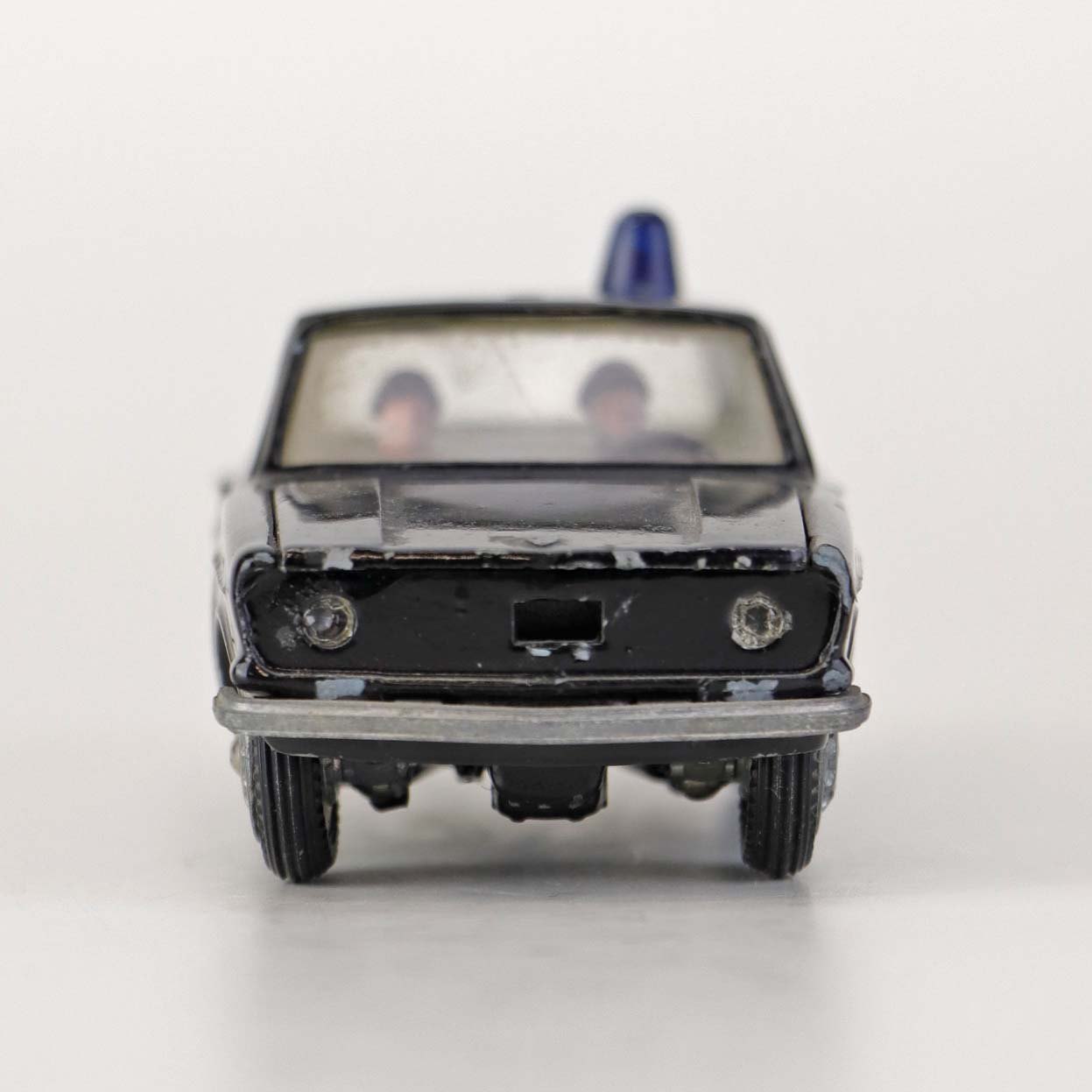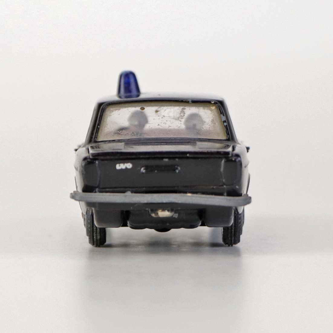 Politibil med to figurer. Legetøjsbil i sortlakeret metal med gummi hjul og blå blinklys. Model Volvo 144Producent Tekno, Denmark