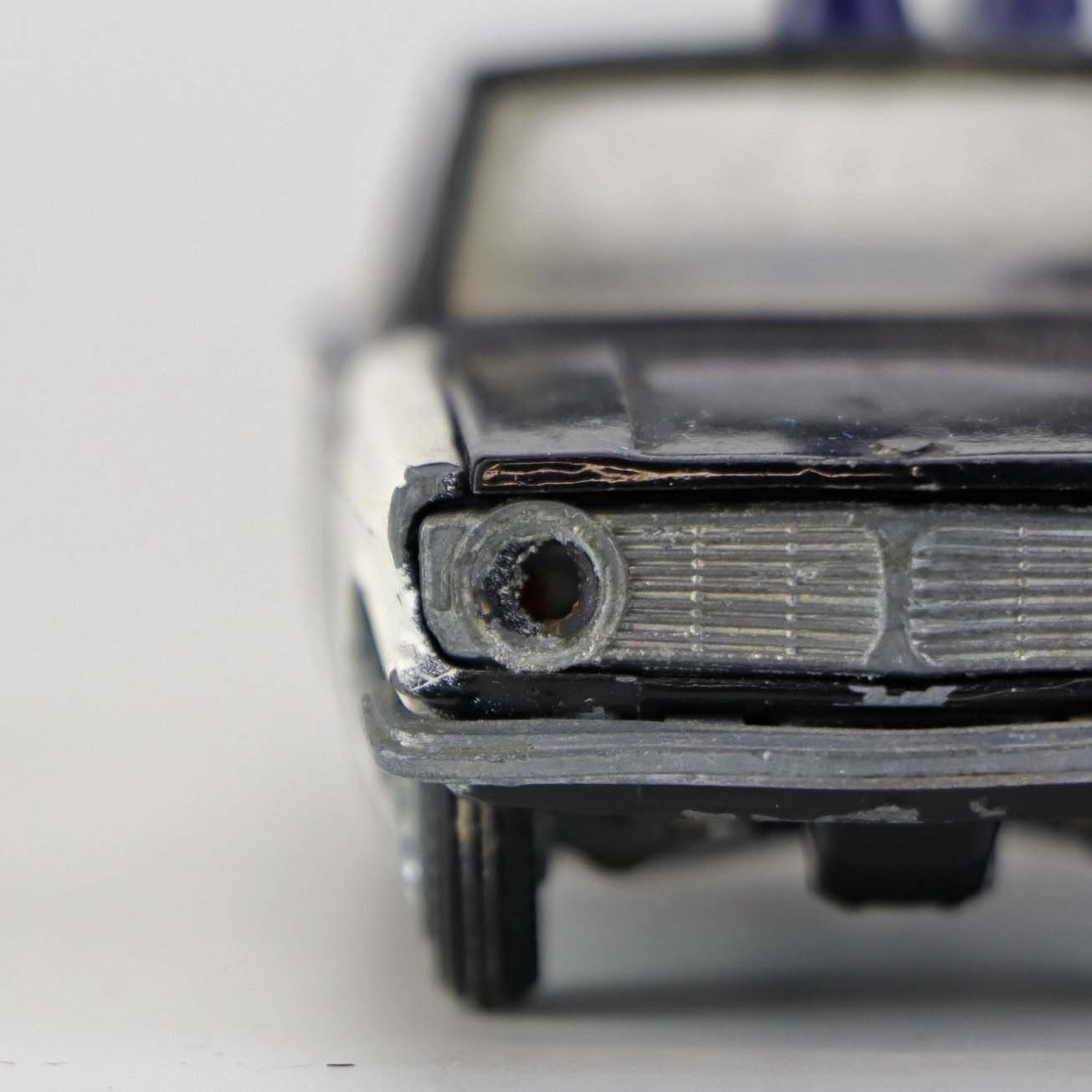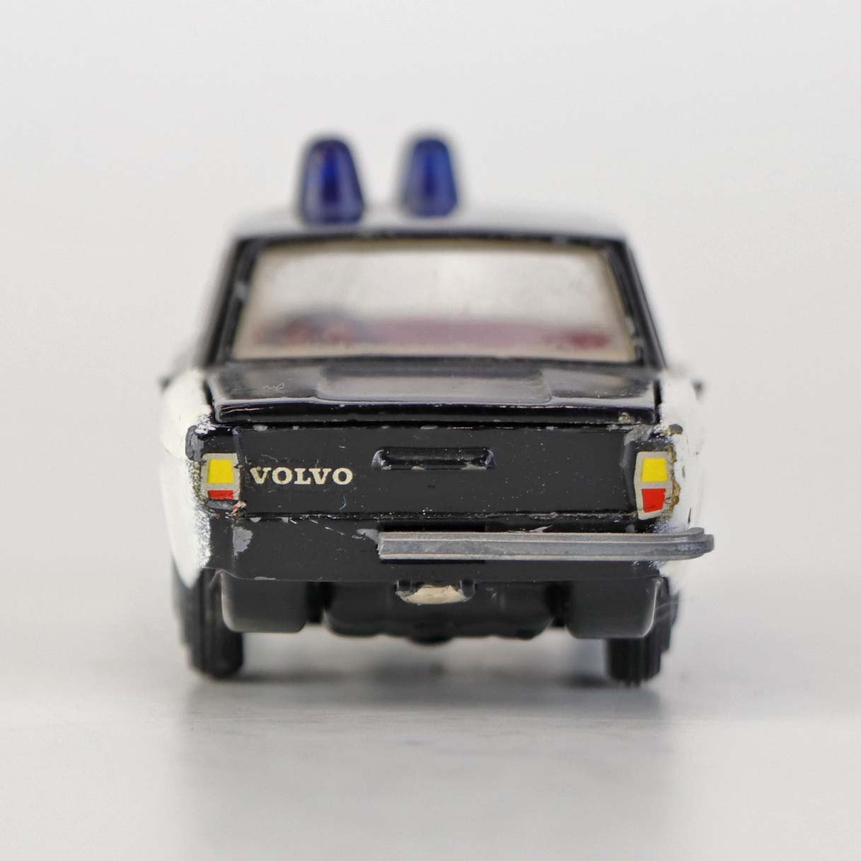 Politibil med to blinklys. Legetøjsbil i sortlakeret metal med gummi hjul og blå blinklys. Model Volvo 144Producent Tekno, Denmark
