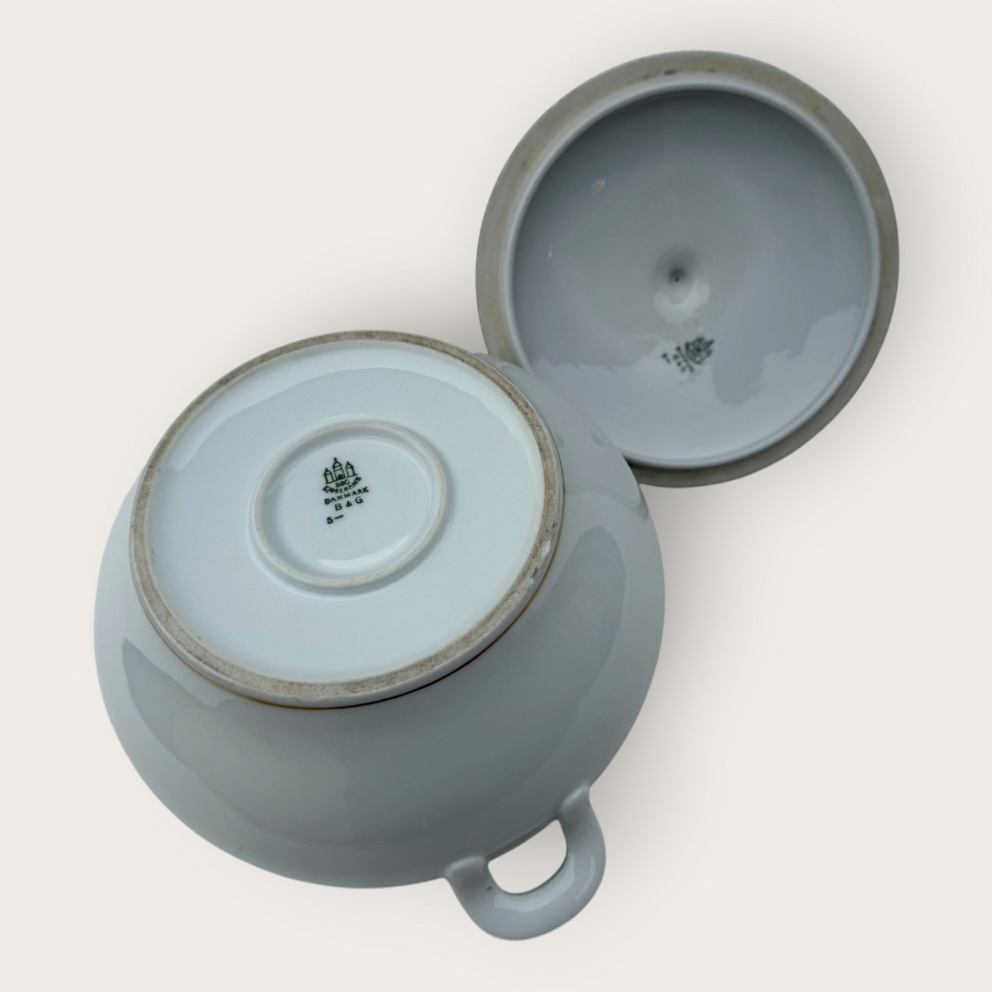 Bing & Grøndahl, Form 643 med bred turkis dekoration og guldkant, Terrin, #5, højde 17cm, bredde 26cm, 2. sortering, *pæn stand*Lager: 2