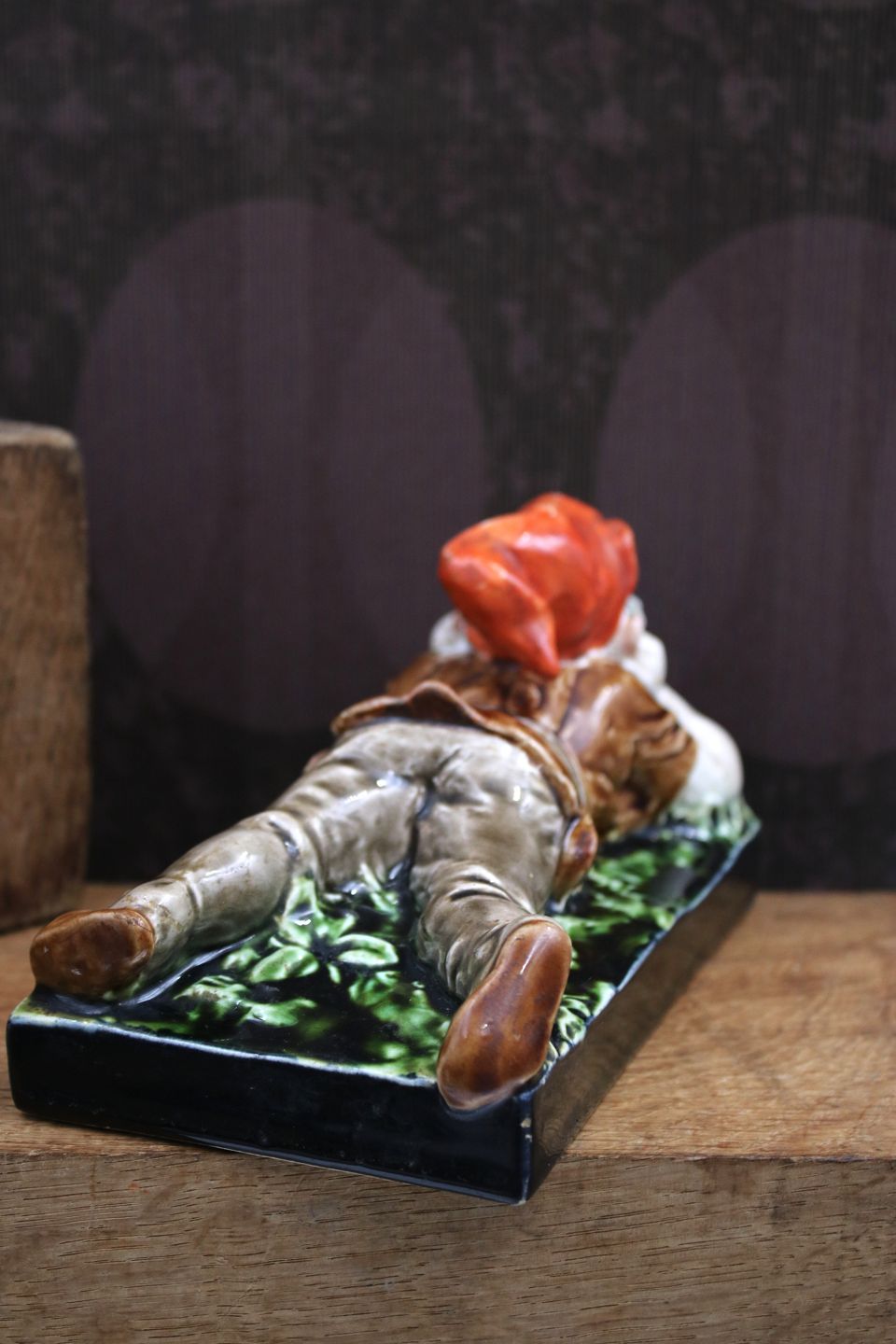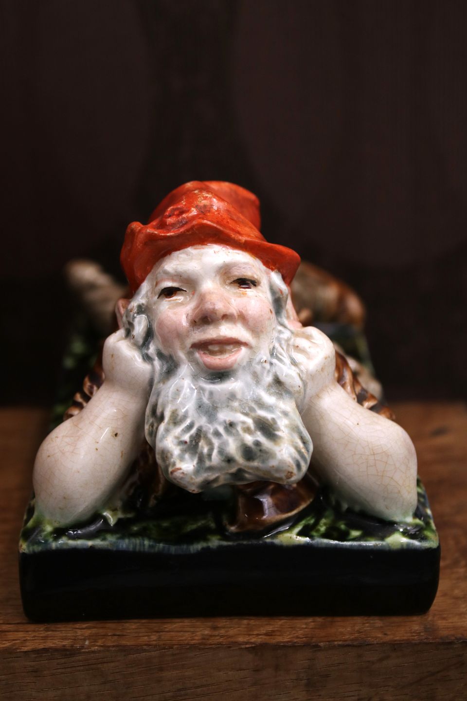 Antik , tysk keramik nisse i fin majolica glasur fra ca. 1880.H: 9cm. L: 17cm. B: 9cm.
