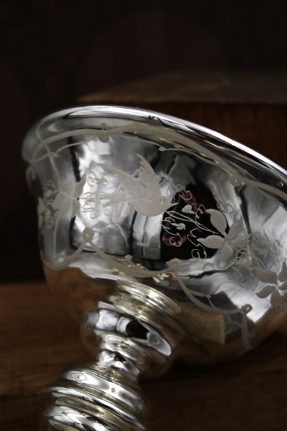 Fransk 1800 tals skål på fod i fattigmandssølv(Mercury glass) med fin ætset dekoration med fugle og bladranker.