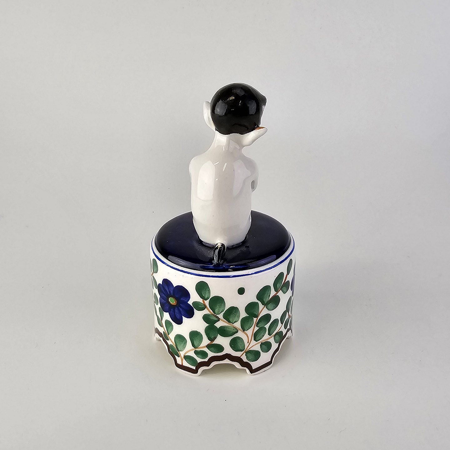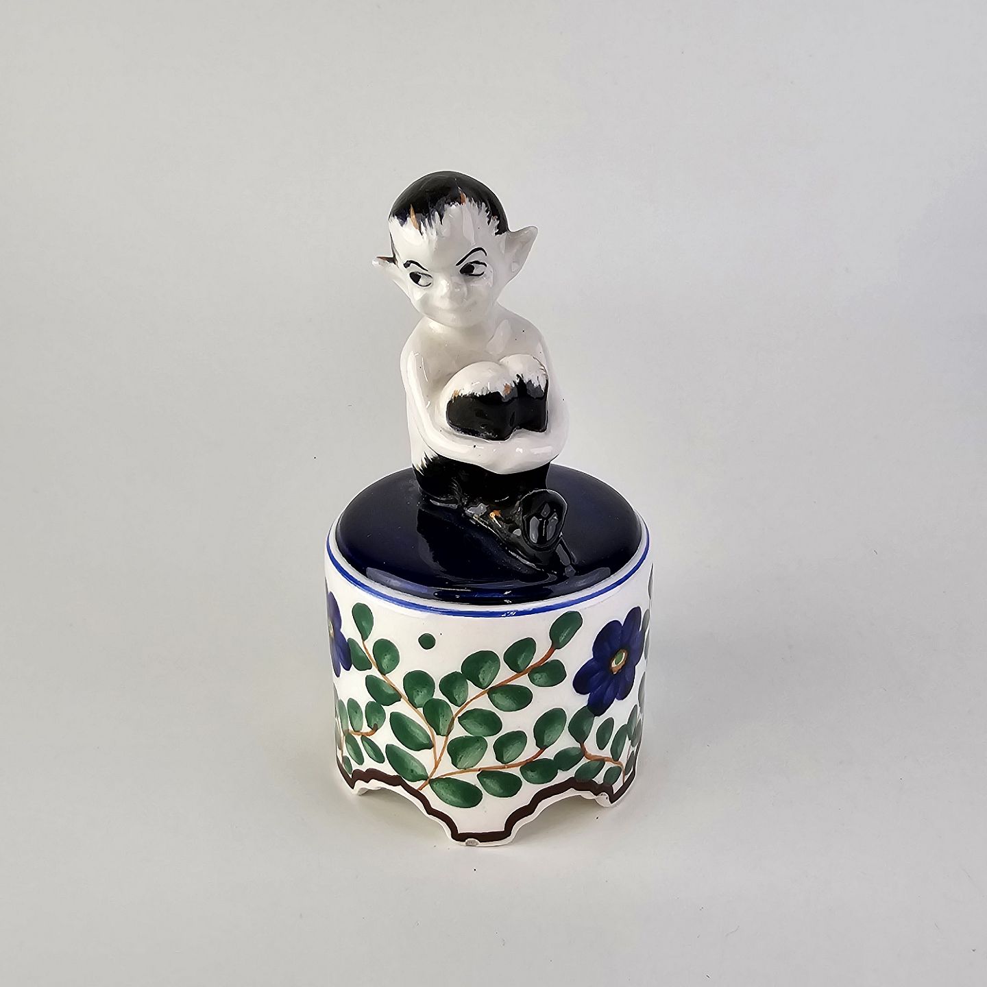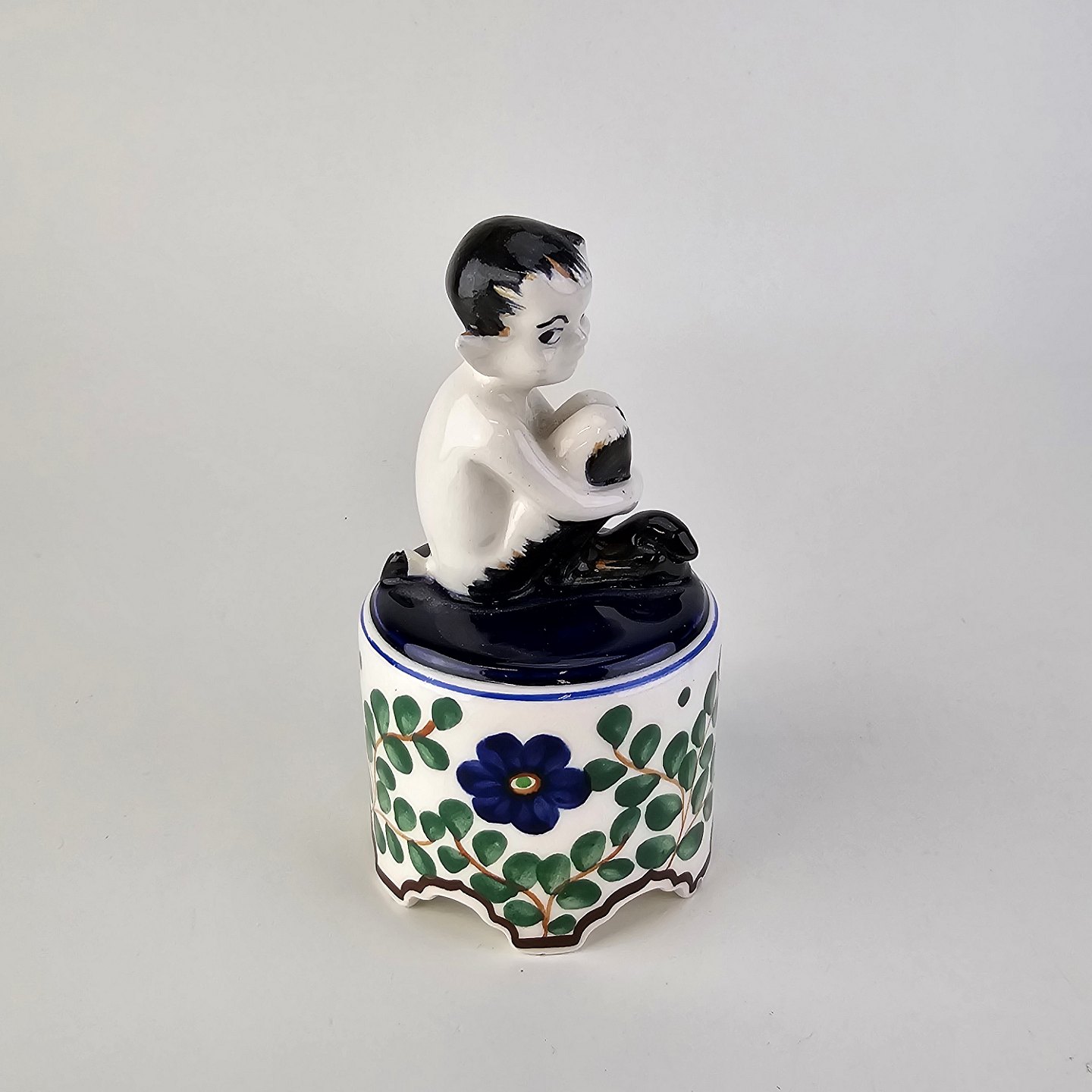 Figur i fajance med motiv af en faun på en opsats med malet blomstermotivNr. 917/786