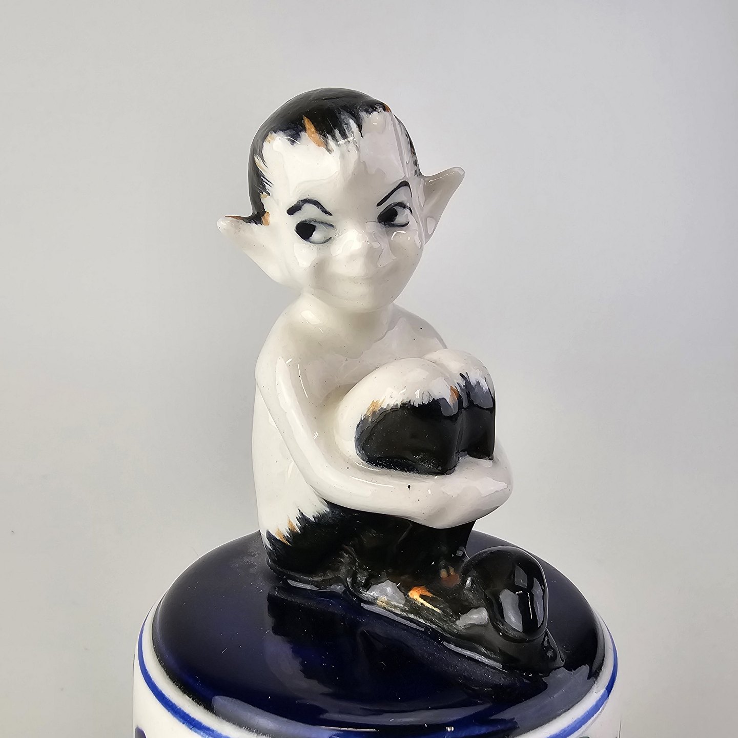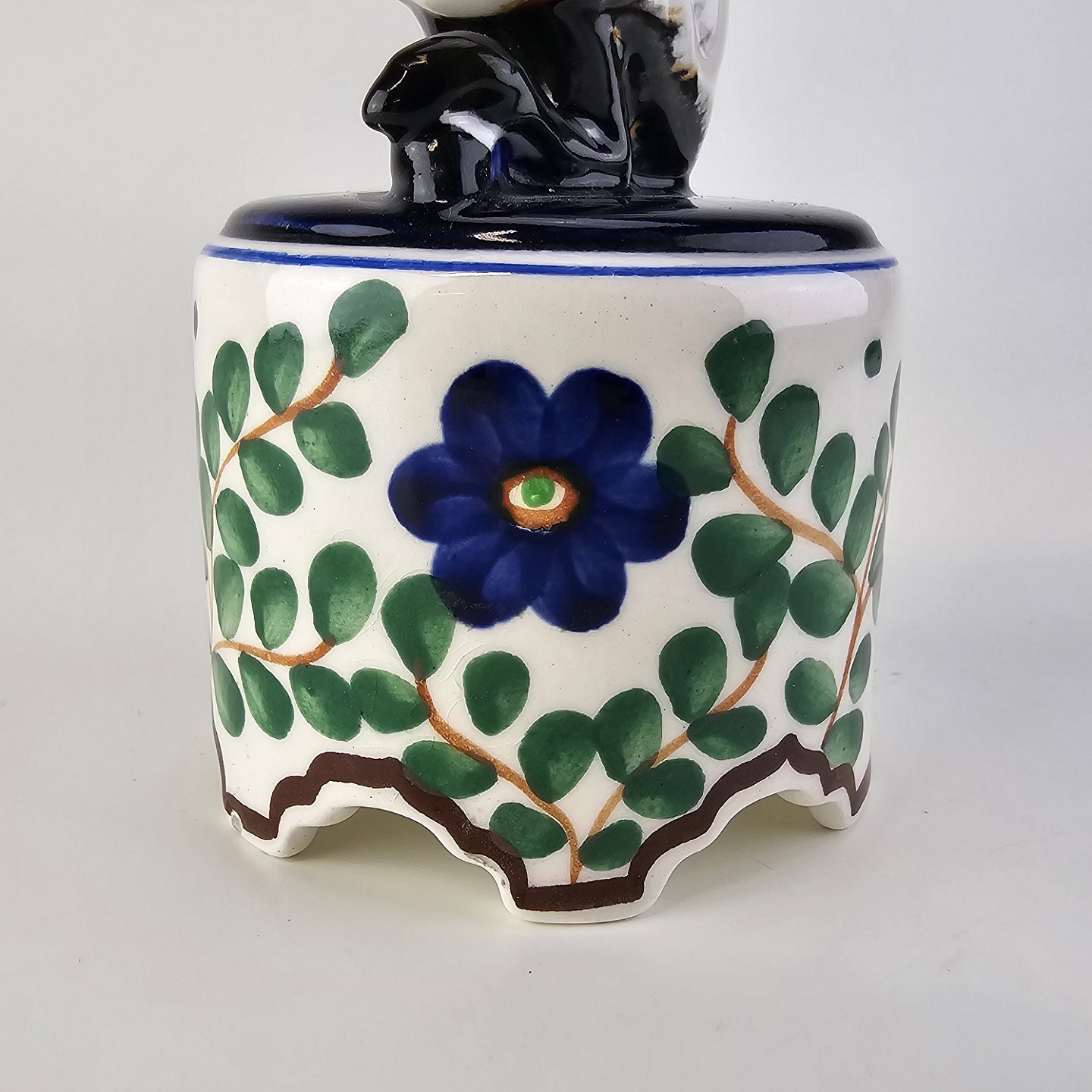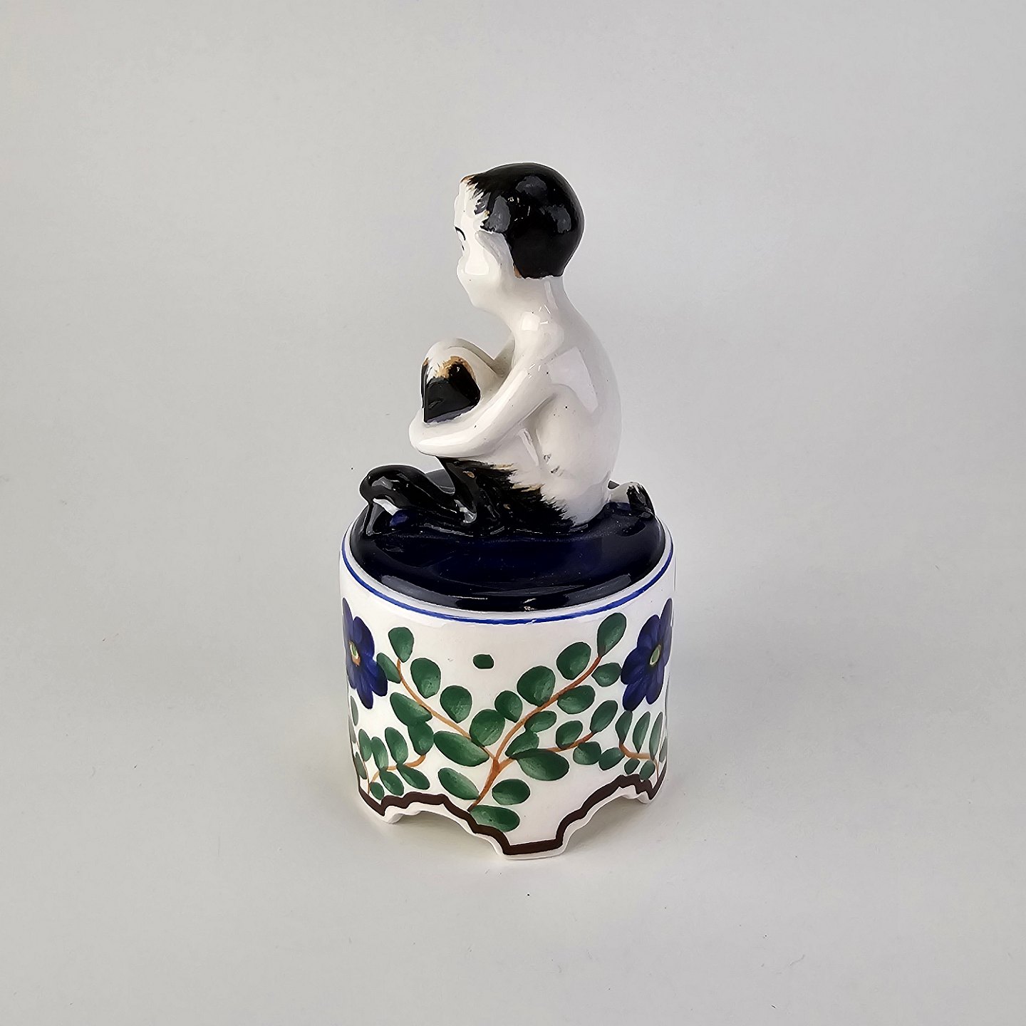 Figur i fajance med motiv af en faun på en opsats med malet blomstermotivNr. 917/786