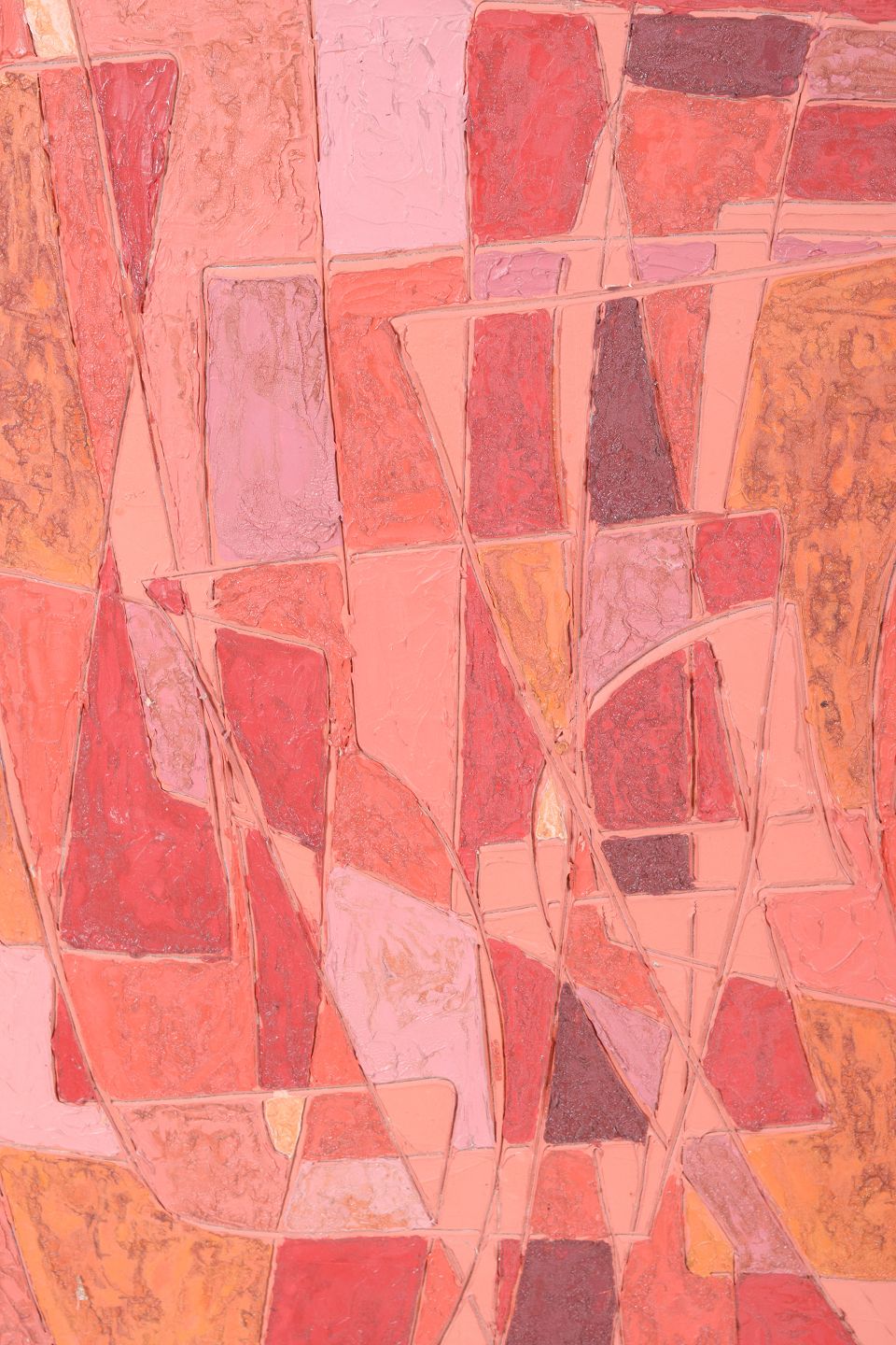Vita Thymann, olie på plade, dansk kunstner.Abstrakt ekspressiv komposition opbygget i et mosaiklignende formsprog med varme røde og rosa nuancer, hvor flader og rytmiske opdelinger danner et dynamisk og dekorativt helhedsindtryk. Signeret VT.