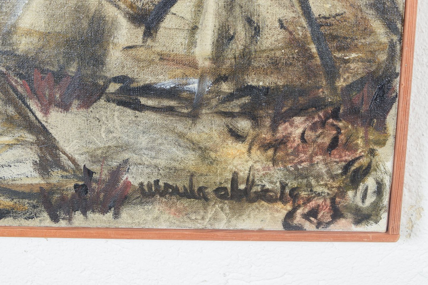 Ursula Ekberg, oliemaleri på lærred, listet svensk billedkunstner.Modernistisk landskabsmotiv fra Lappland med samiske telte gengivet i en ekspressiv og let abstraheret form. Udført i dæmpede jordfarver med fri penselføring, signeret.