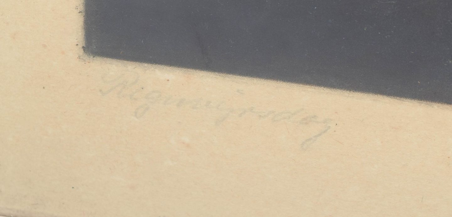 Peter Ilsted, farve mezzotinte, “Regnvejrsdag”, dansk kunstner.Stille interiørscene med figurer omkring et bord i dæmpet lys, udført som mezzotinte i Ilsteds karakteristiske tonale og atmosfæriske stil. Signeret i blyant.