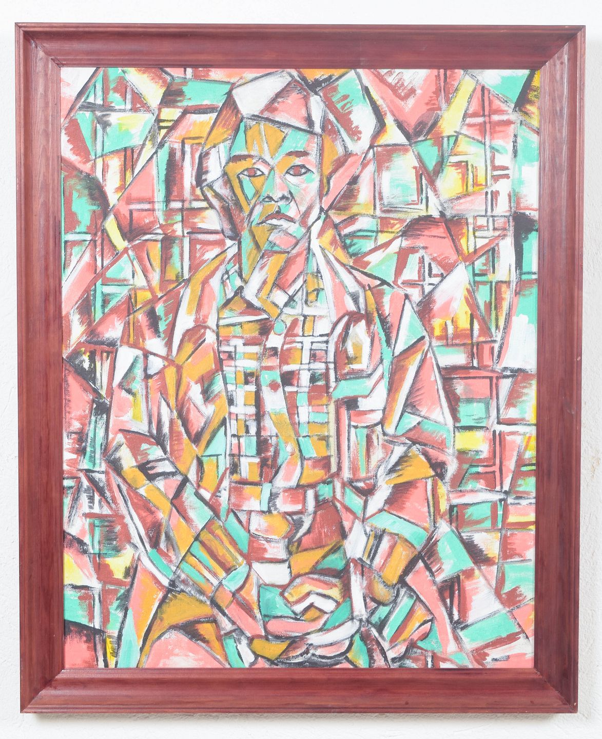 Charles Njan (født 1950), abstrakt figurkomposition, tanzaniansk kunstner.Farverig kubistisk inspireret figurkomposition med geometrisk opdelt motiv og ekspressiv penselføring, udført i olie på lærred. Usigneret.