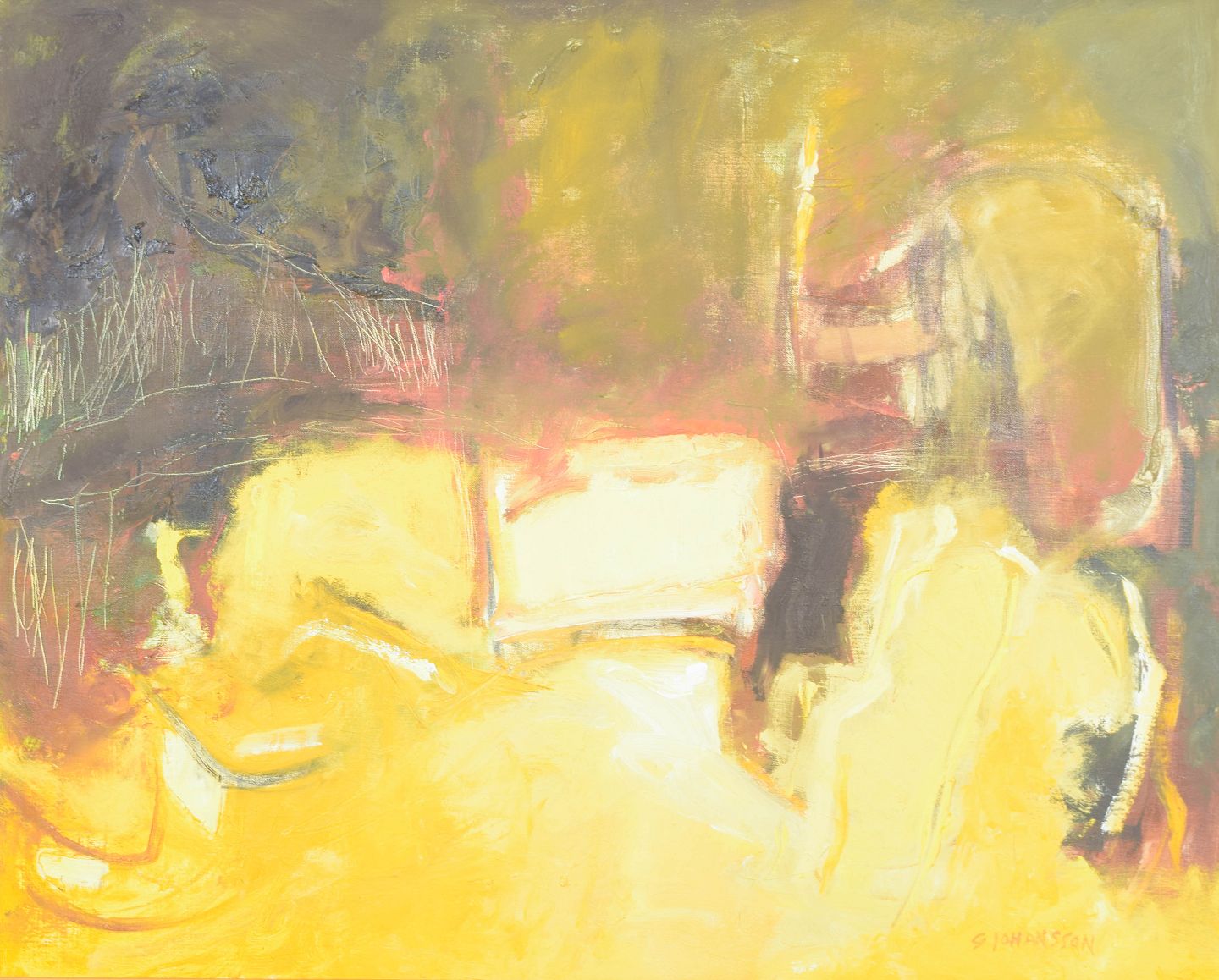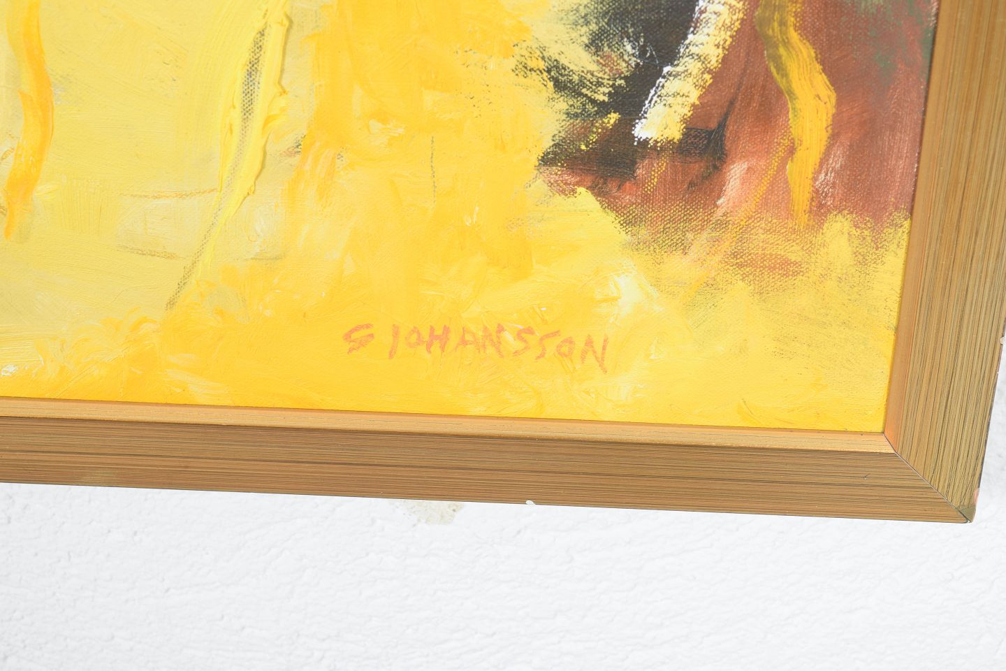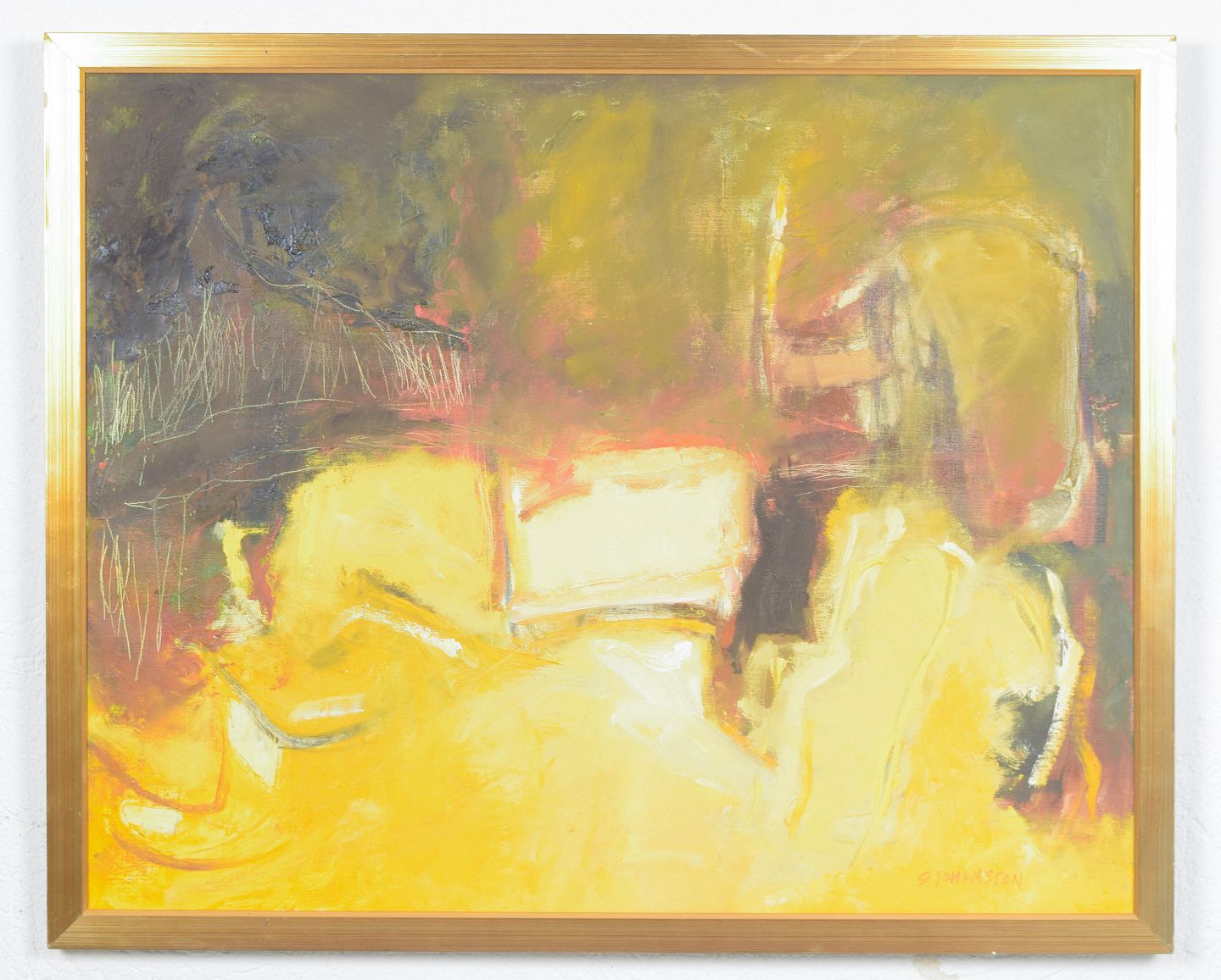 G. Johansson, abstrakt komposition, svensk kunstner.Abstrakt komposition udført i olie på lærred med figurative antydninger og bløde, opløste former i varme farvetoner. Signeret.