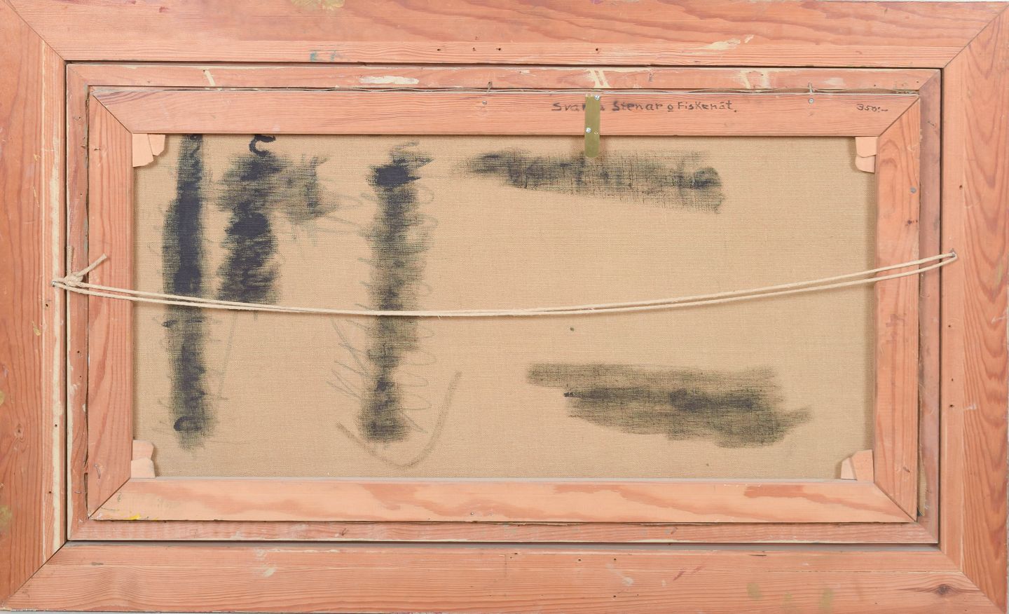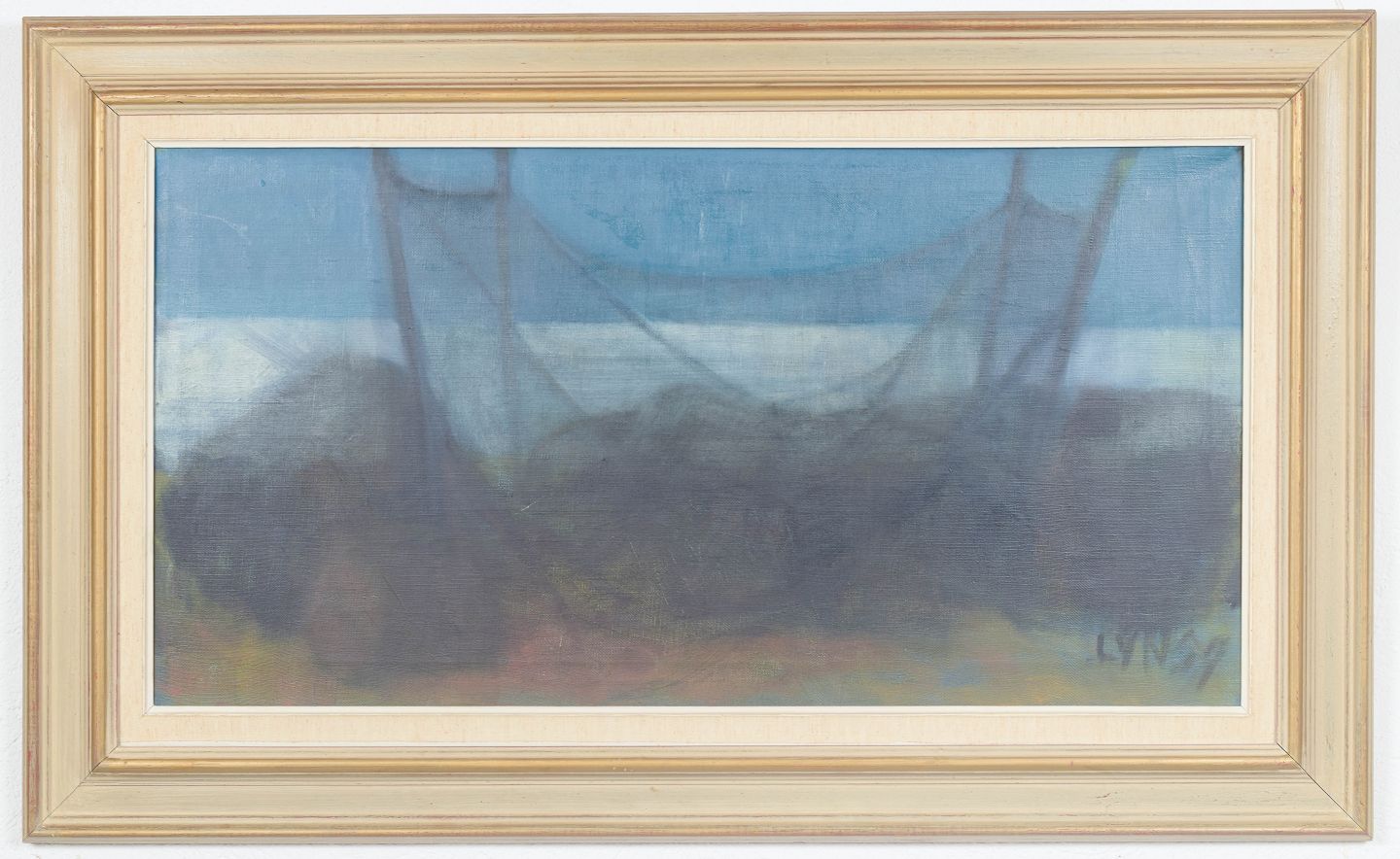 Lars Yngve Nilsson, “Svarta stenar o fiskenät”, olie på lærred, svensk kunstner.Modernistisk komposition med stiliseret landskabsmotiv, hvor mørke former og netstrukturer fremstår i en dæmpet og atmosfærisk farveholdning. Udført i olie på lærred, signeret og dateret 1959.