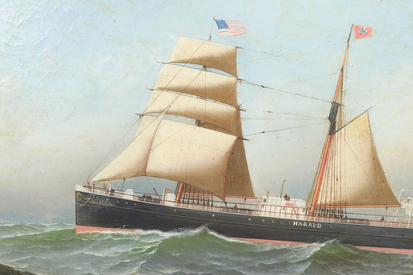 Antonio Jacobsen, marinemaleri, listet dansk-amerikansk kunstner.Detaljeret skildring af dampskib under sejl på åbent hav med bølgende sø og klar himmel. Motivet er udført med stor præcision i gengivelsen af skibets konstruktion og rigging, karakteristisk for kunstnerens maritime værker.