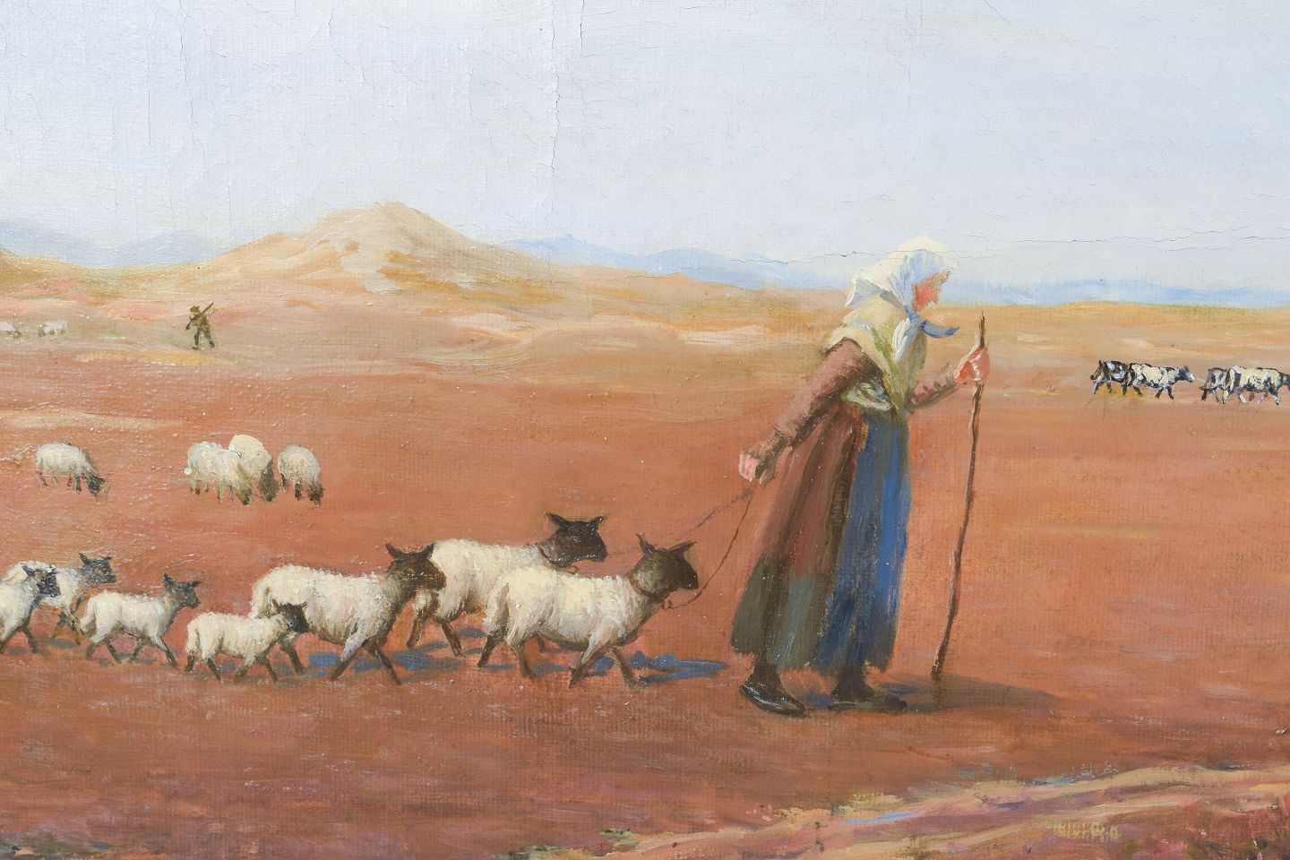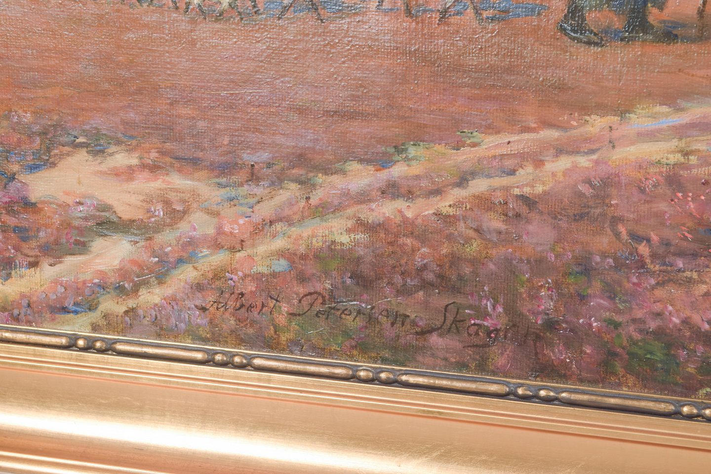 Albert Petersen, “Dyrene tages hjem”, olie på lærred, listet dansk kunstner.Naturalistisk landskabsmotiv med hyrde og fåreflok i åbent terræn, udført i en rolig og stemningsfuld farveholdning. Kompositionen afspejler landlivets rytme omkring århundredeskiftet, med fokus på lys, rum og fortælling. Signeret.