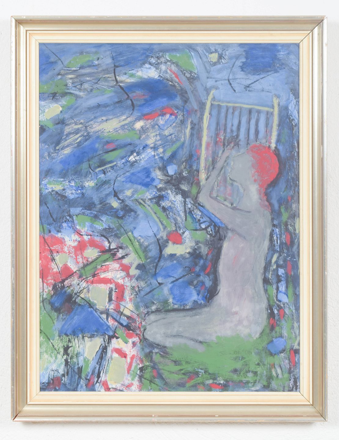 Viggo Loos, oliemaleri på plade, listet svensk billedkunstner.Abstrakt komposition med dynamisk penselføring og lagdelte farvefelter i blå, grønne og røde nuancer, udført i olie på plade. Usigneret.