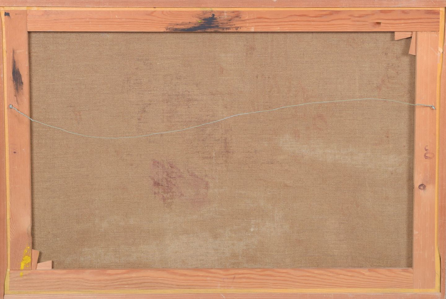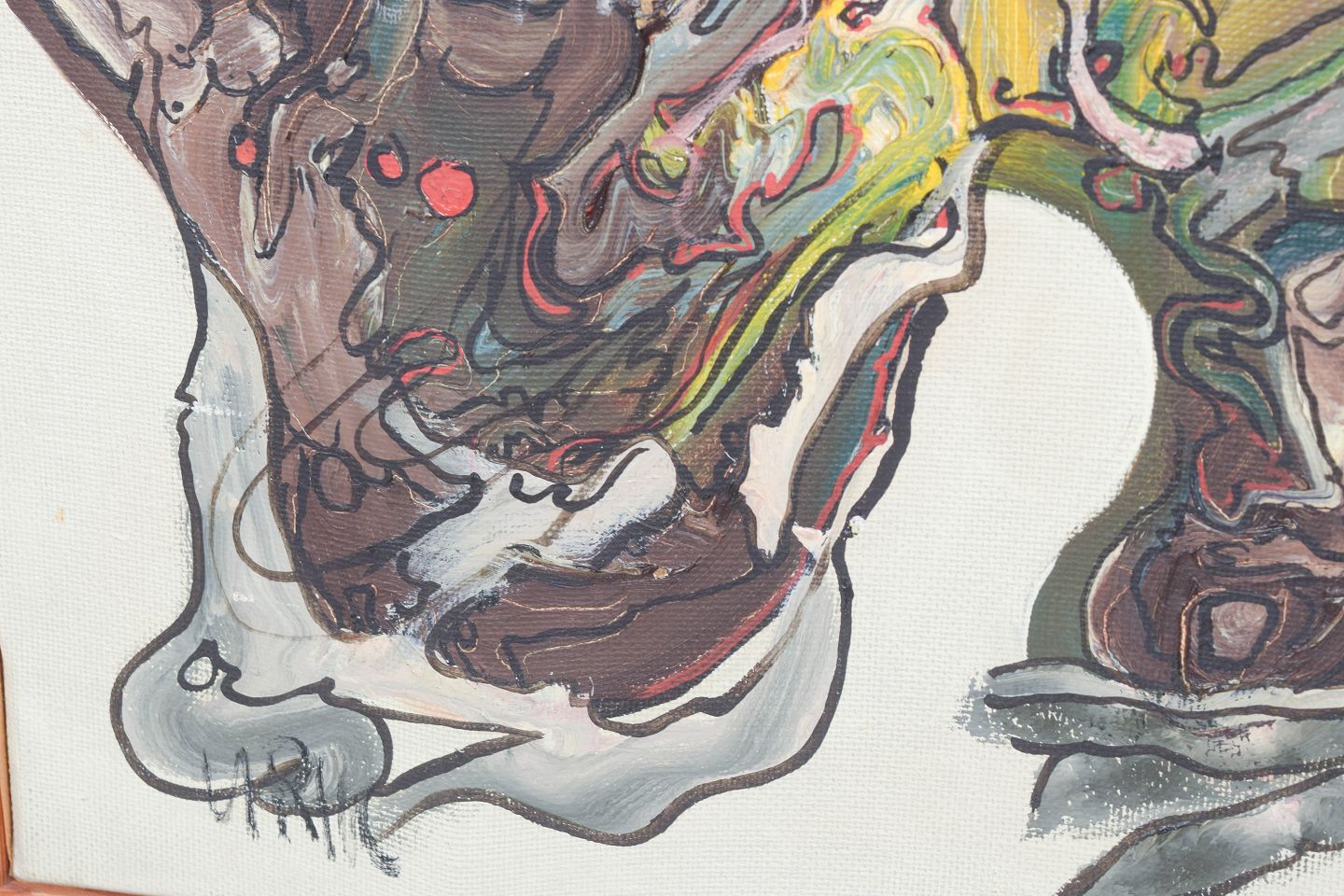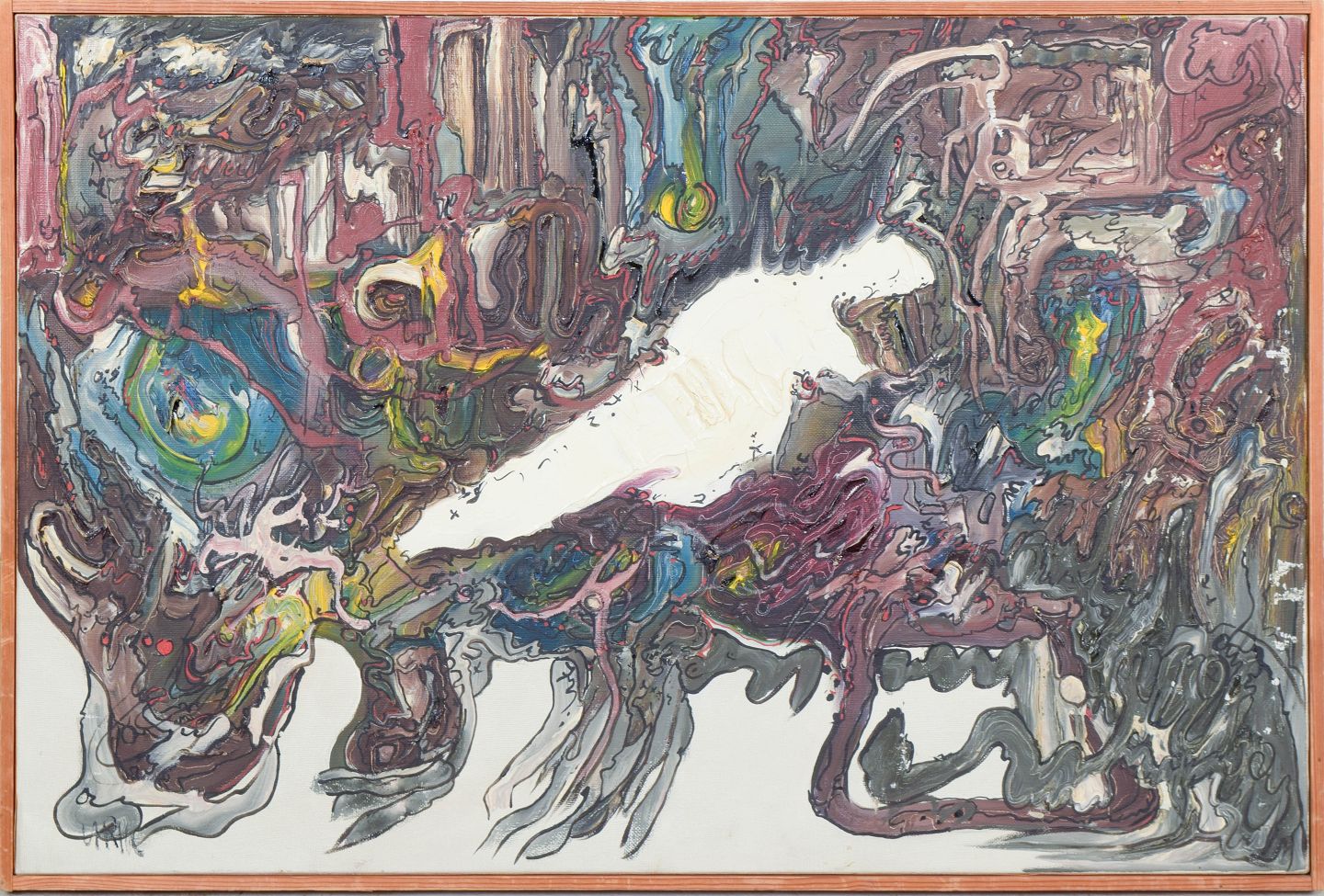 Ulf Eriksson, oliemaleri på lærred, listet svensk billedkunstner.Abstrakt og ekspressivt komposition med organiske, næsten biomorfe former og komplekse lag af farve i dybe røde, blå og jordede toner. Dynamisk opbygning med flydende konturer og en intens, gestisk penselføring, signeret.