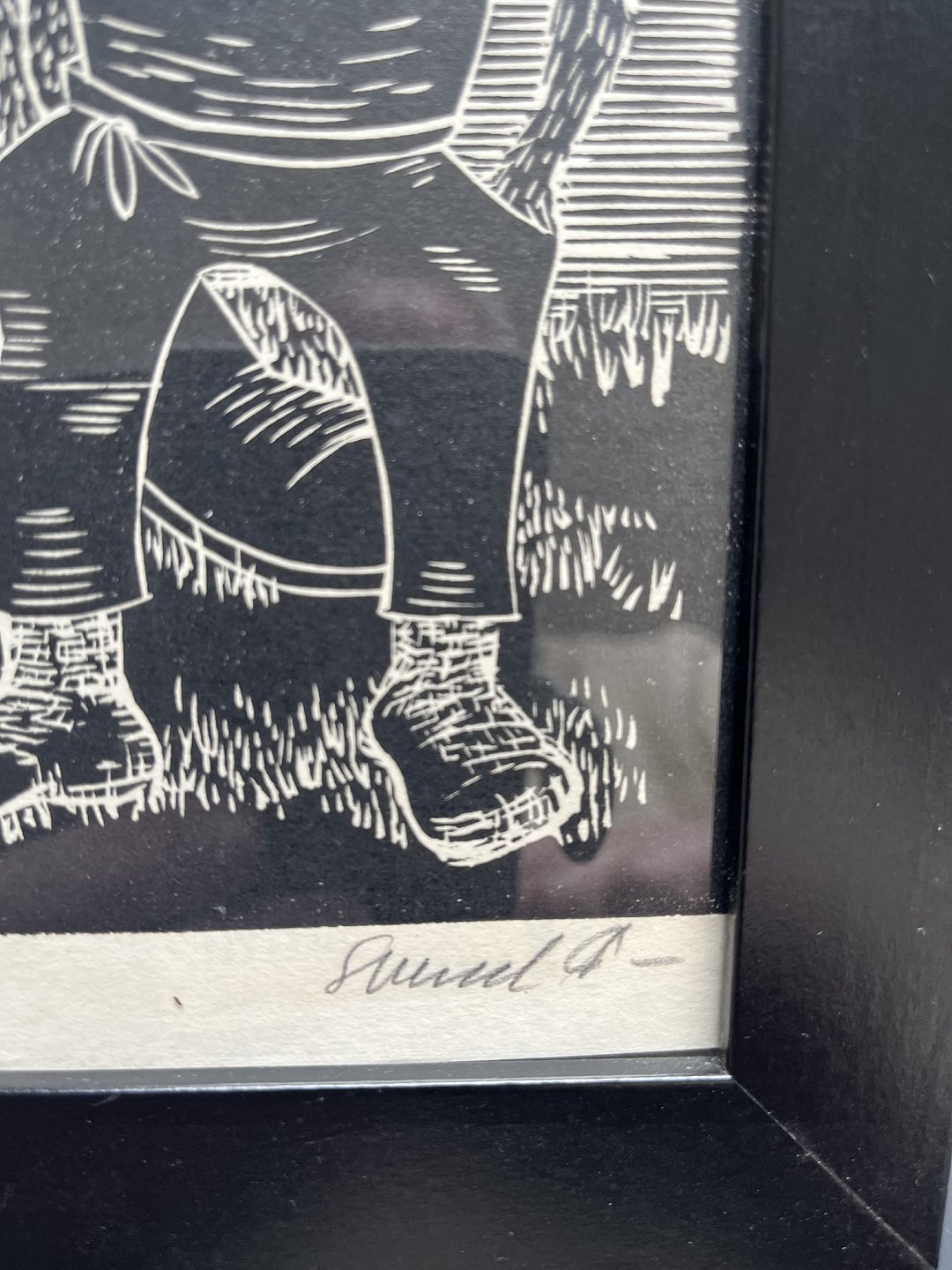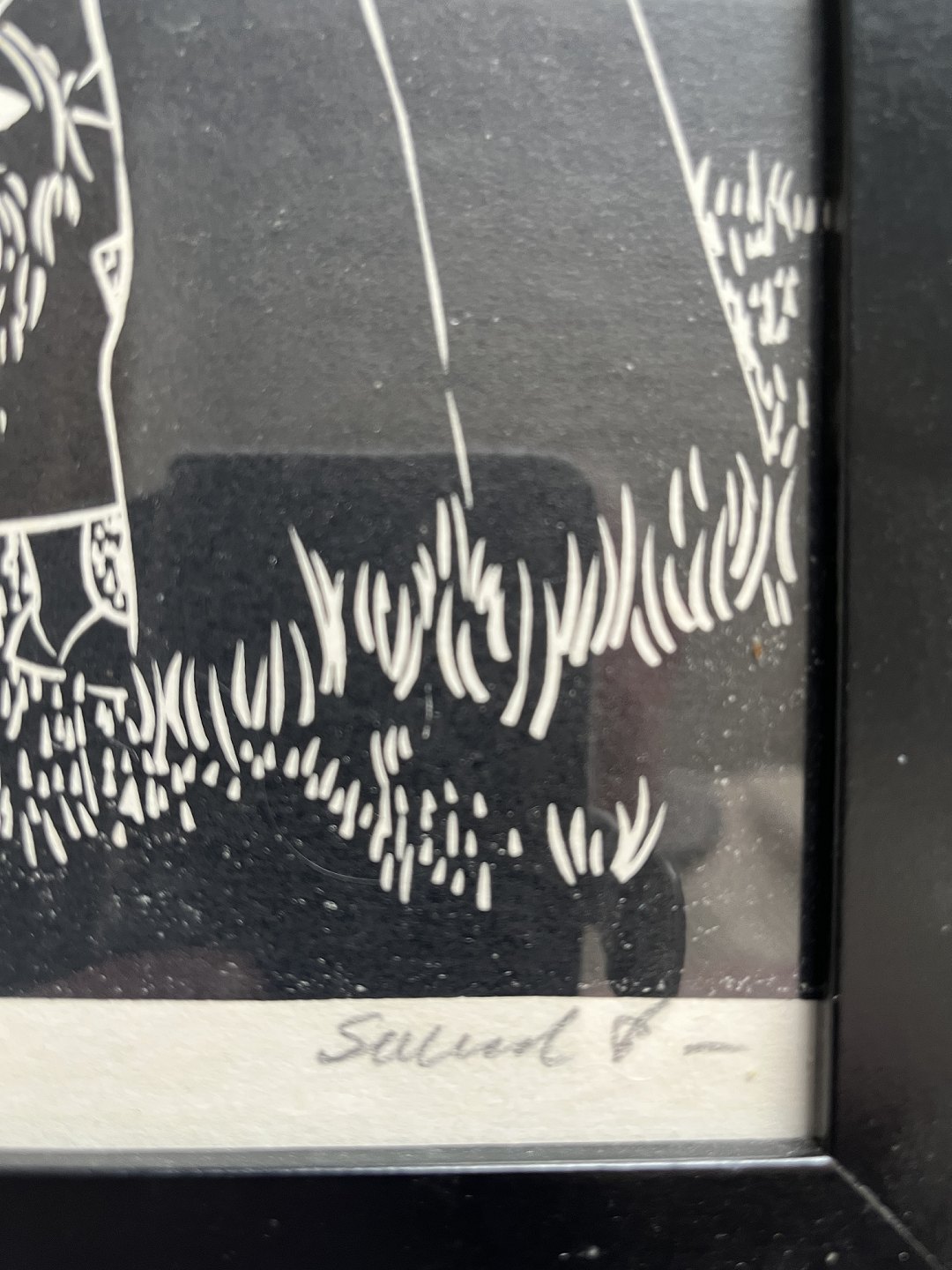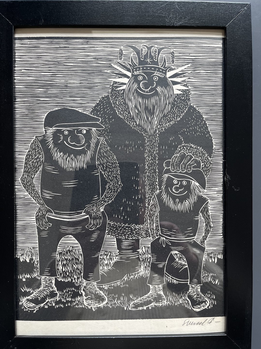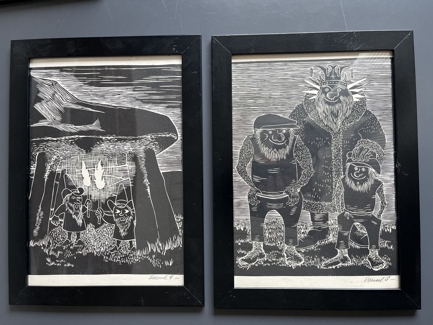 2 linoleumssnit af Svend P. Jørensen 1973.