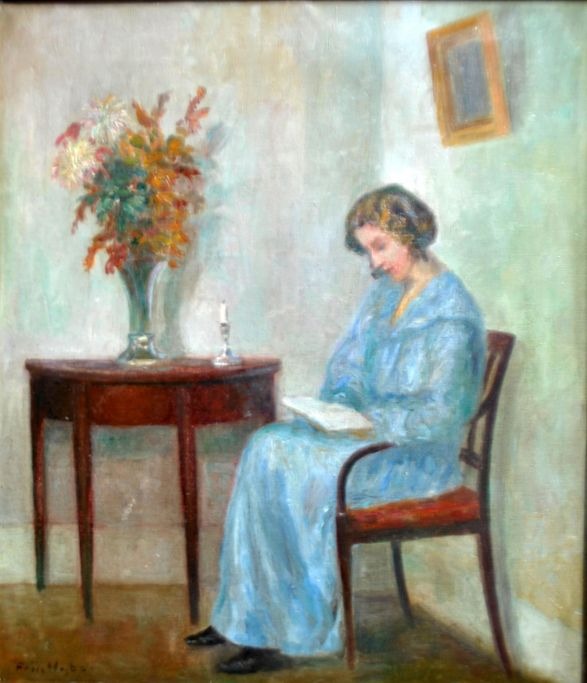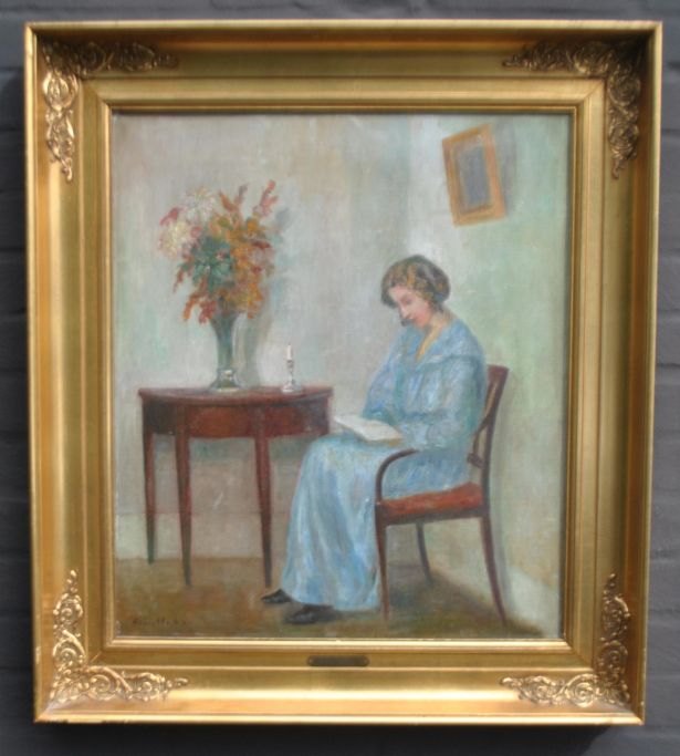 Friis Nybo, Poul (1869 - 1929) Danmark: En læsende kvinde. Olie på lærred. Signeret. 51 x 60 cm.Indrammet med en hjørnamenteret ramme. 77 x 67 cm.