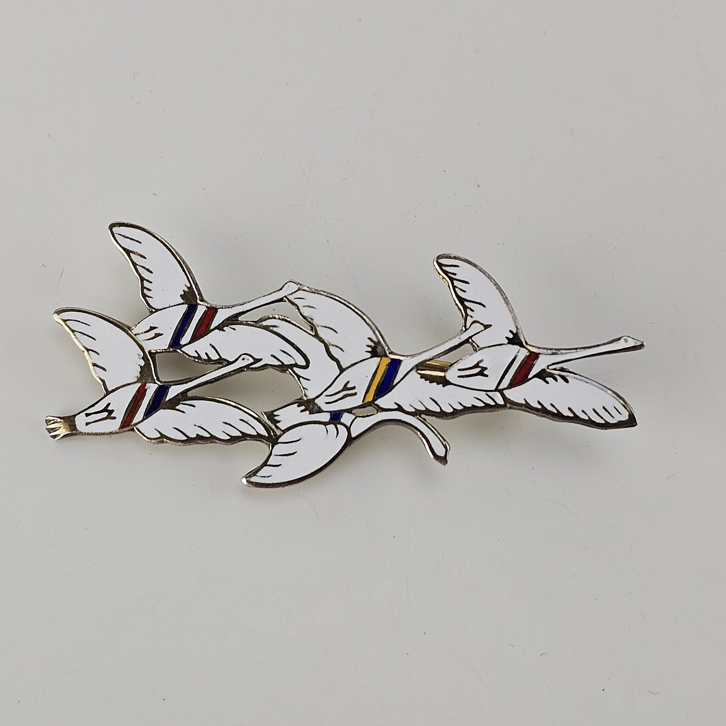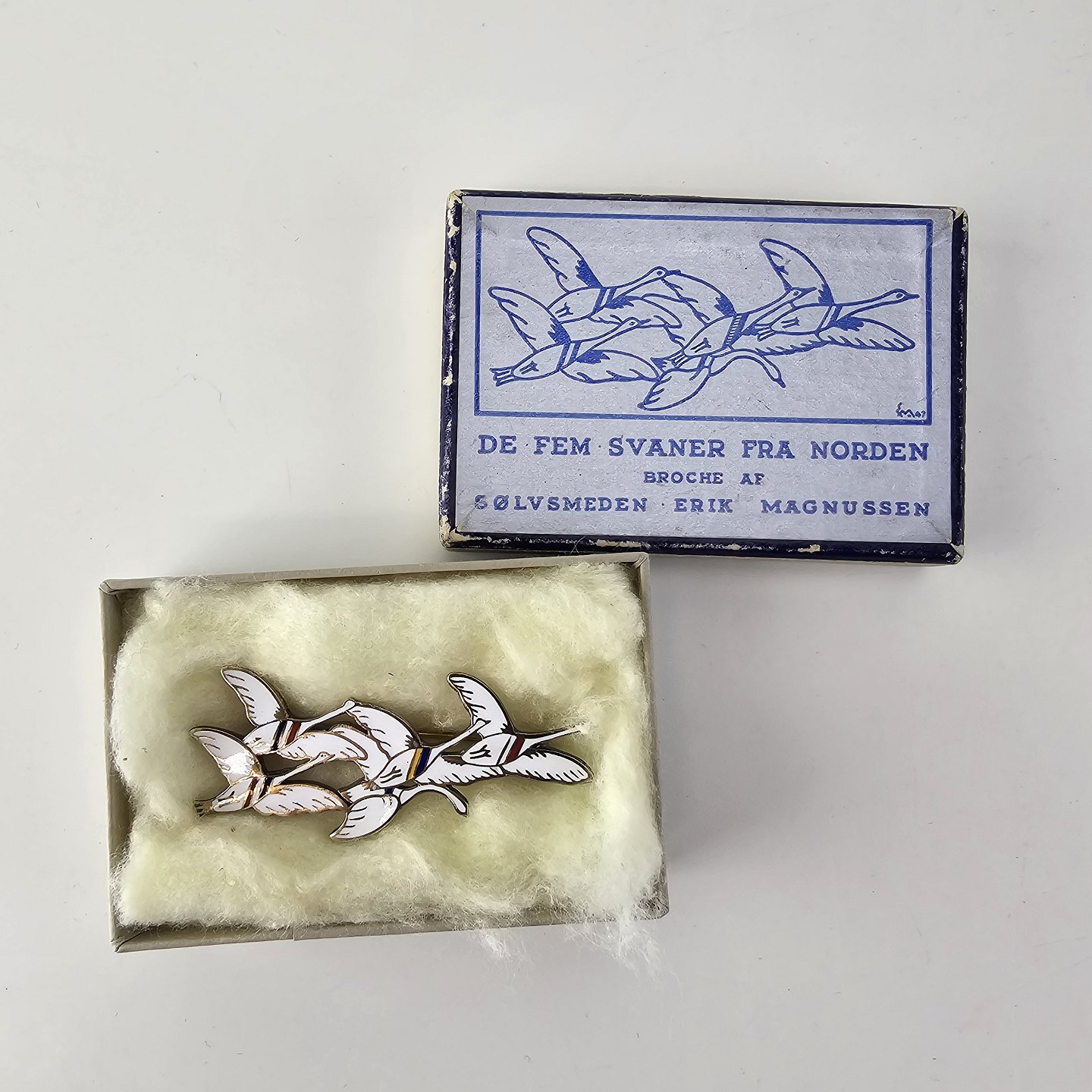 Broche i sterling sølv og emalje med motiv af fem svaner dekoreret med farver for de fem nordiske landeInklusiv original kasse, sjældent
