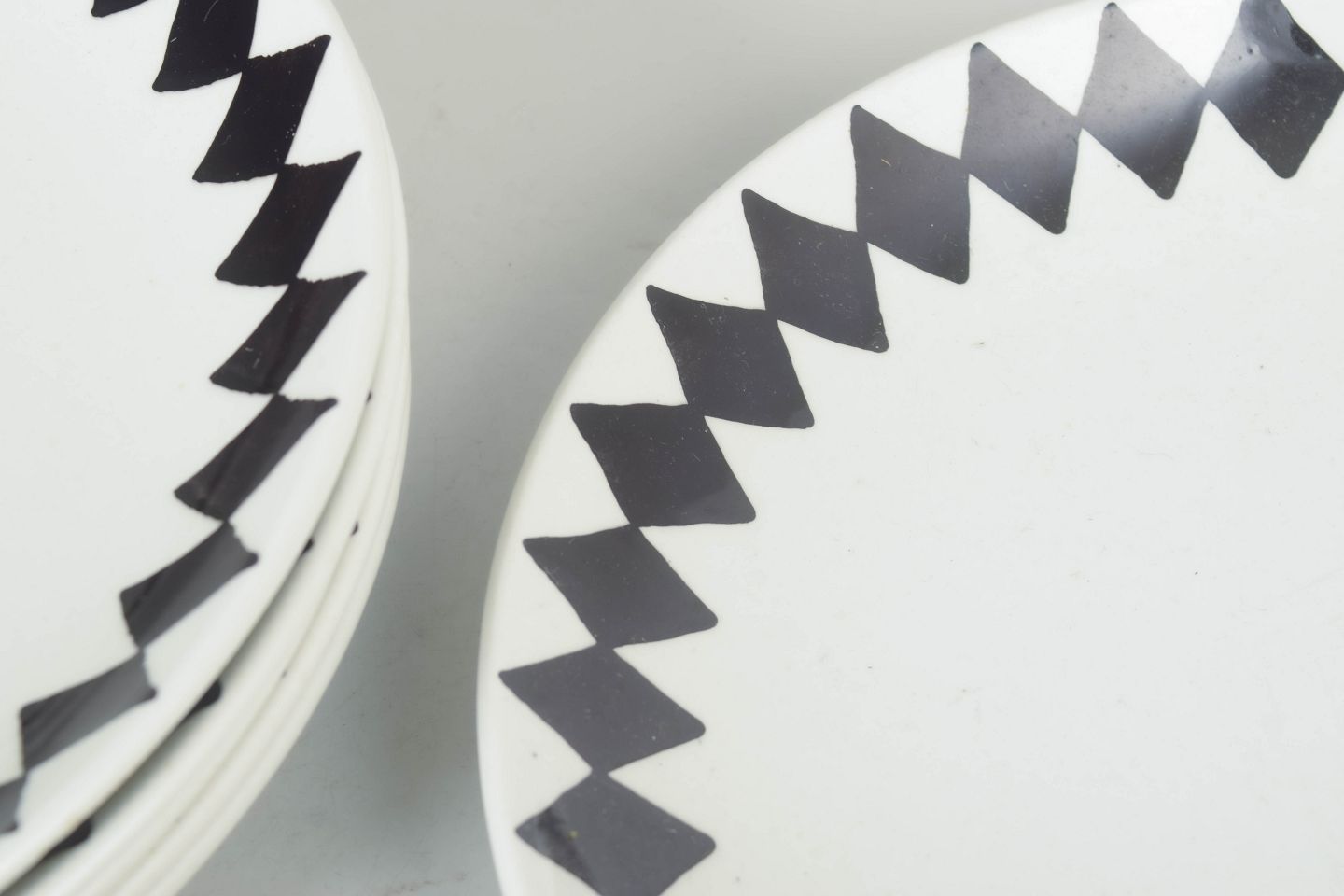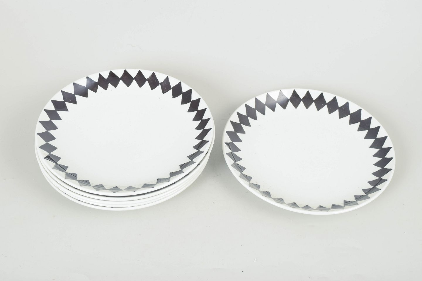 Karin Björquist for Gustavsberg, frokosttallerkener “Svart Ruter”, sæt af seks.Sæt bestående af seks små frokosttallerkener i porcelæn med karakteristisk sort rudemønster, udført i et enkelt og funktionelt formsprog fra perioden.