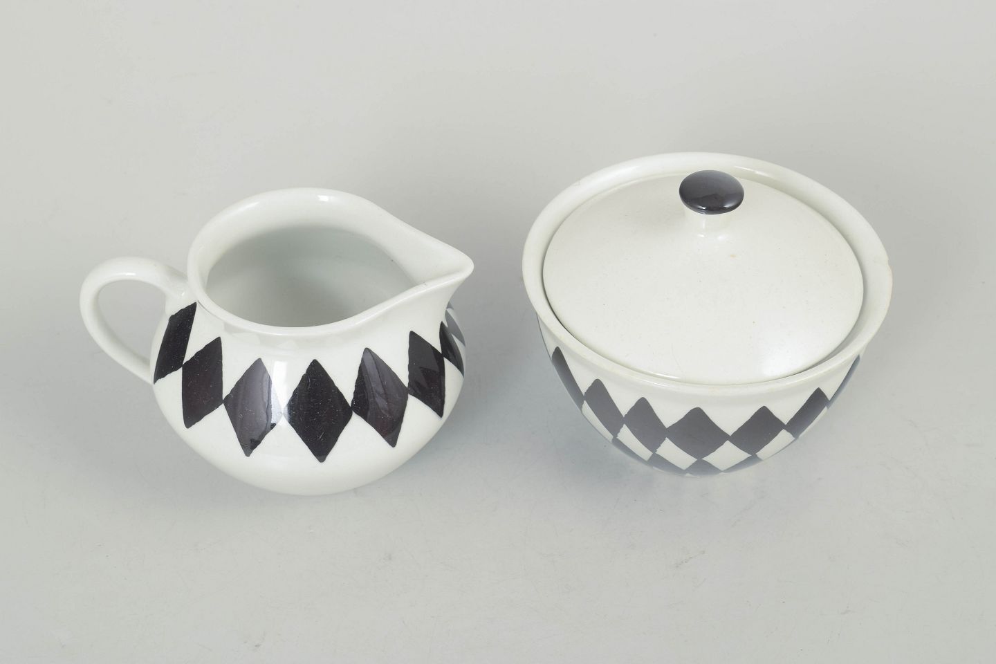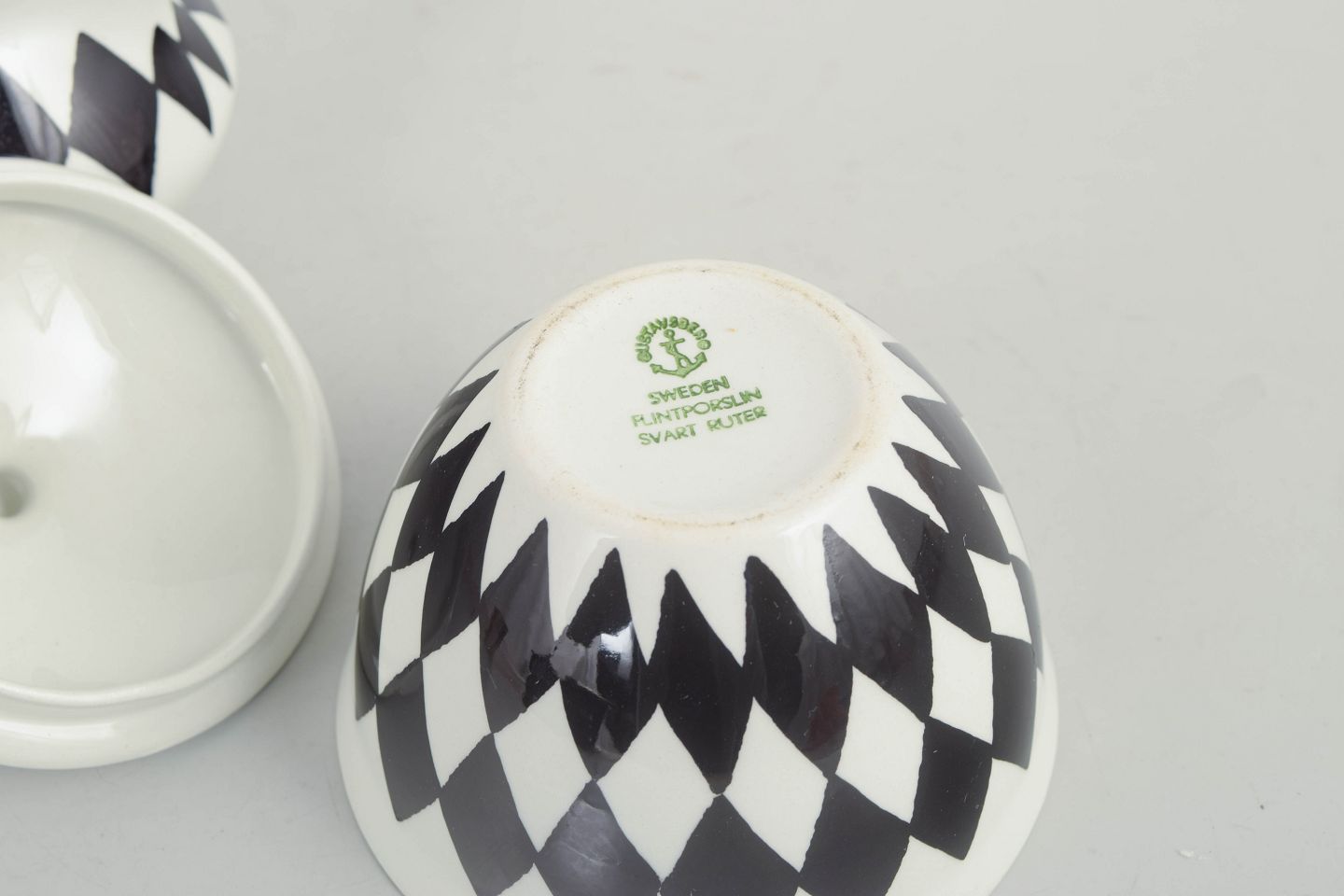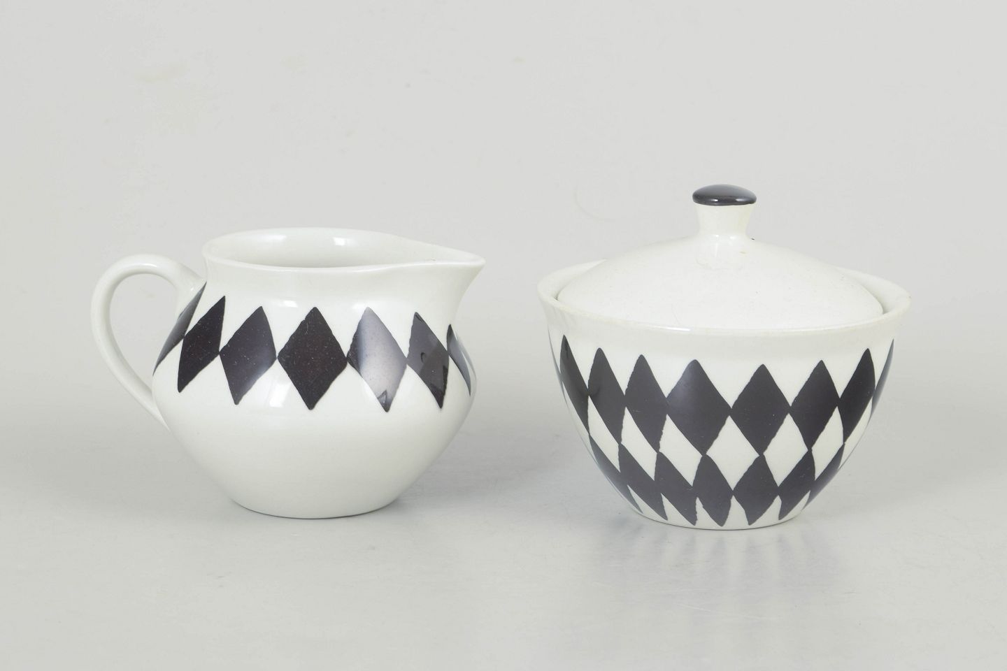 Karin Björquist for Gustavsberg, flødesæt “Svart Ruter”.Sæt bestående af sukkerskål med låg og flødekande i porcelæn med karakteristisk sort rudemønster, udført i et enkelt og funktionelt formsprog fra perioden.