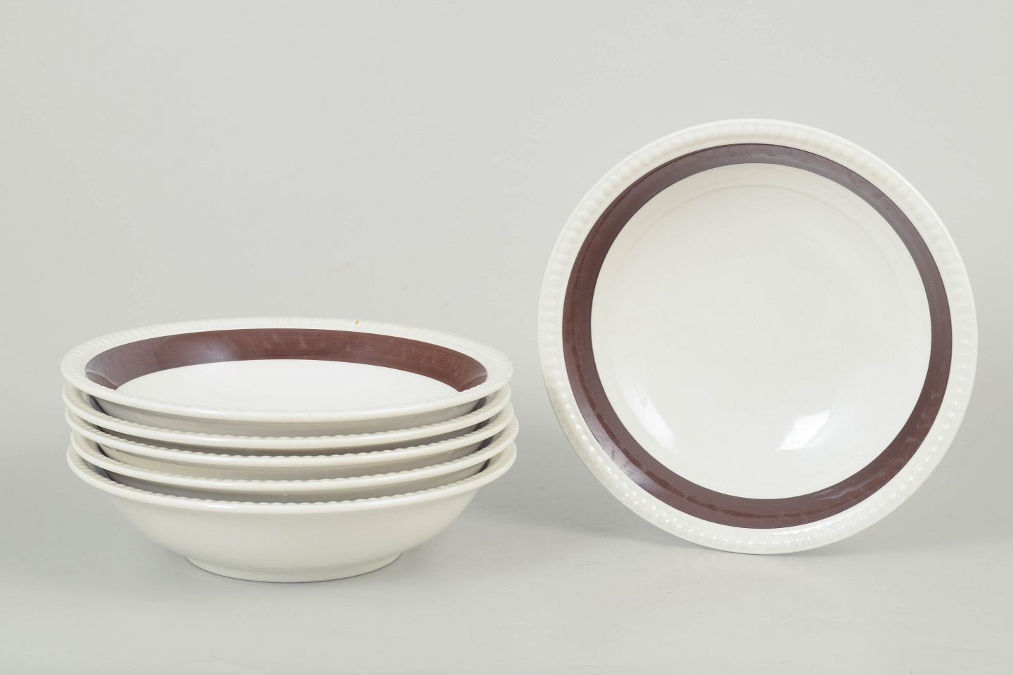 Gefle "Malta", sæt af seks dybe tallerkener.Klassisk retro stel i porcelæn med brun randdekoration på hvid bund, karakteristisk for skandinavisk bordservice fra midten af det 20. århundrede.