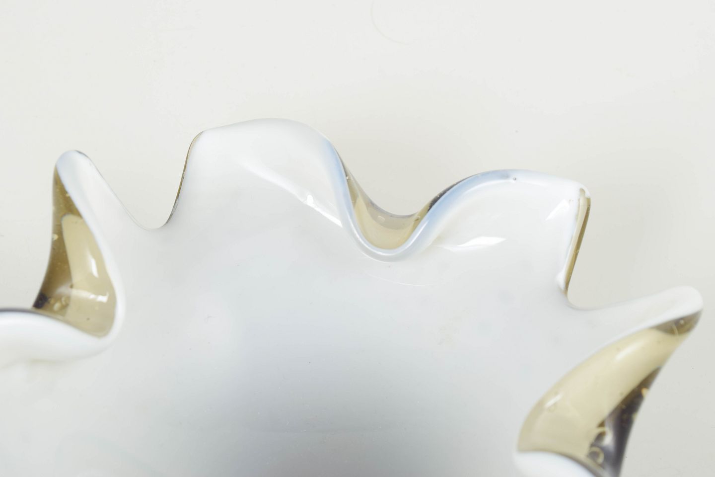 Murano glasskål i organisk form.Dekorativ mundblæst skål med bølgende kant og indfangede luftbobler i klart og gyldent glas.