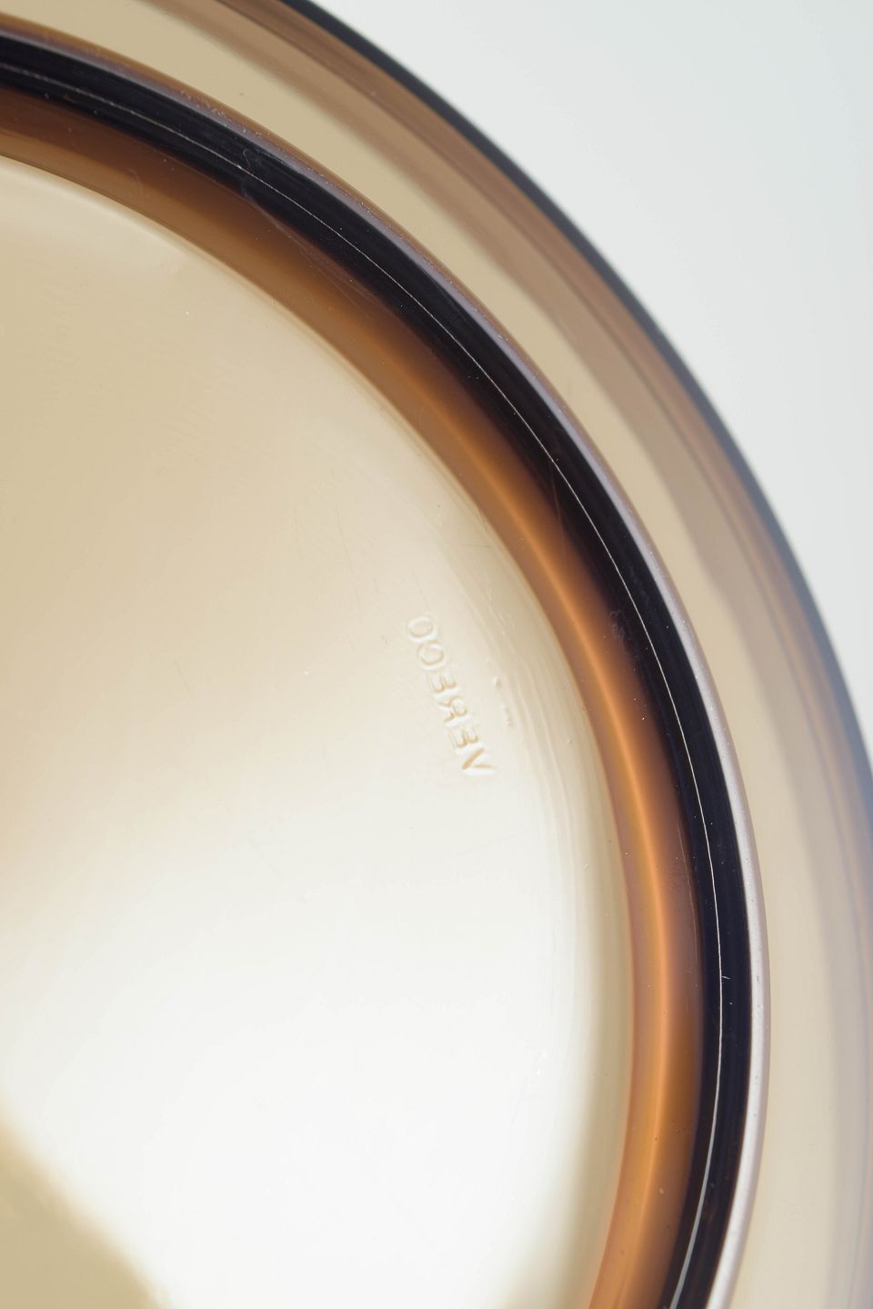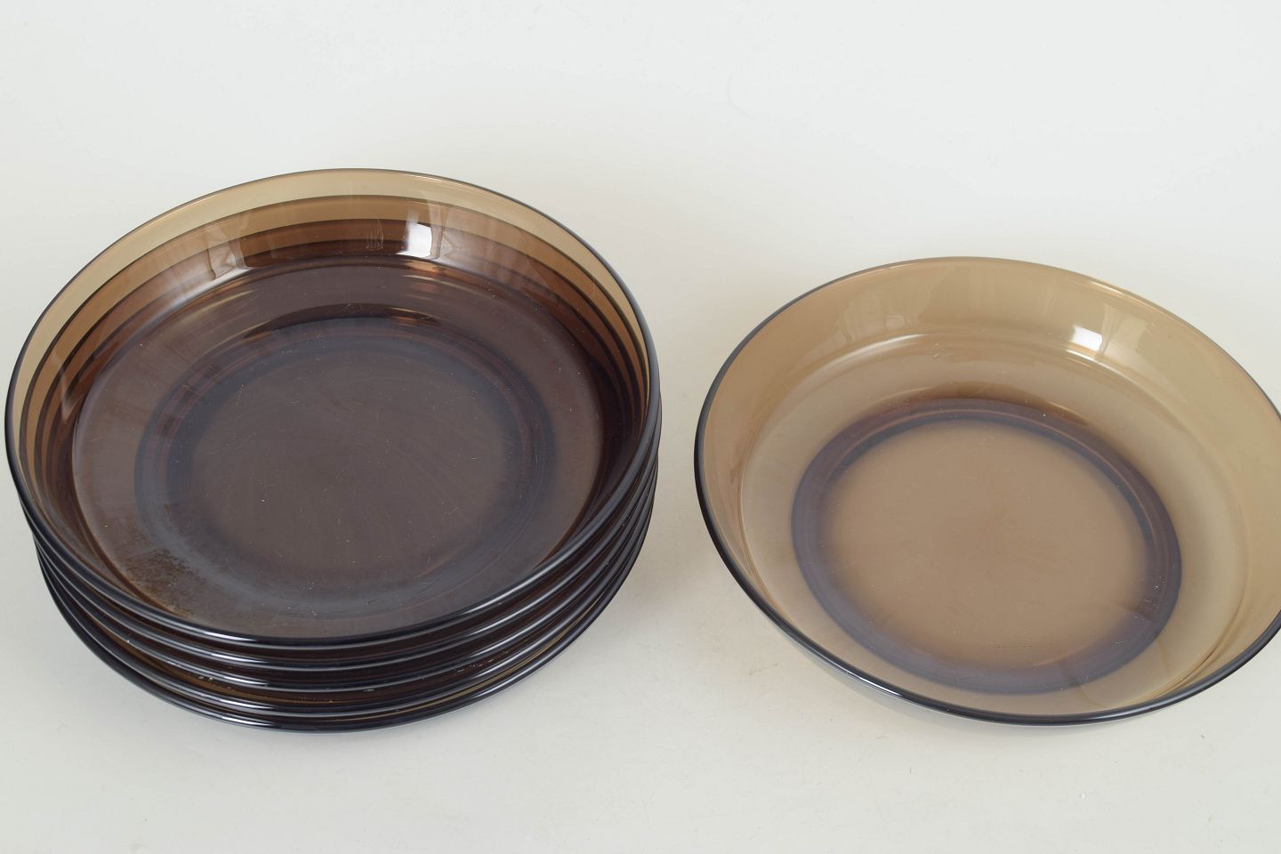 Vereco, sæt af seks .Seks dybe tallerkener i presset glas med lav, bred form og røgfarvet toning, fremstillet i Frankrig og mærket fra producenten.
