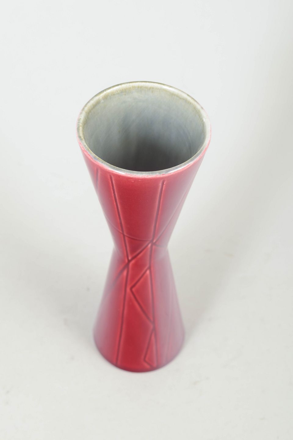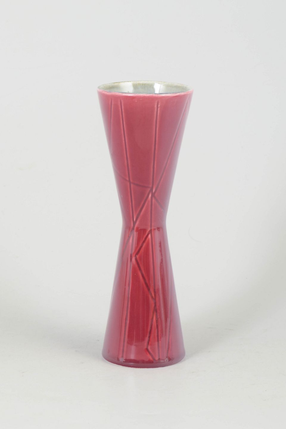 Carl-Harry Stålhane for Rörstrand, California vase.Slank timeglasformet vase i glaseret stentøj med dyb rød glasur og indridset dekor. Modellen "California" er et karakteristisk eksempel på Stålhane’s elegante og stramt formgivne keramik fra perioden.