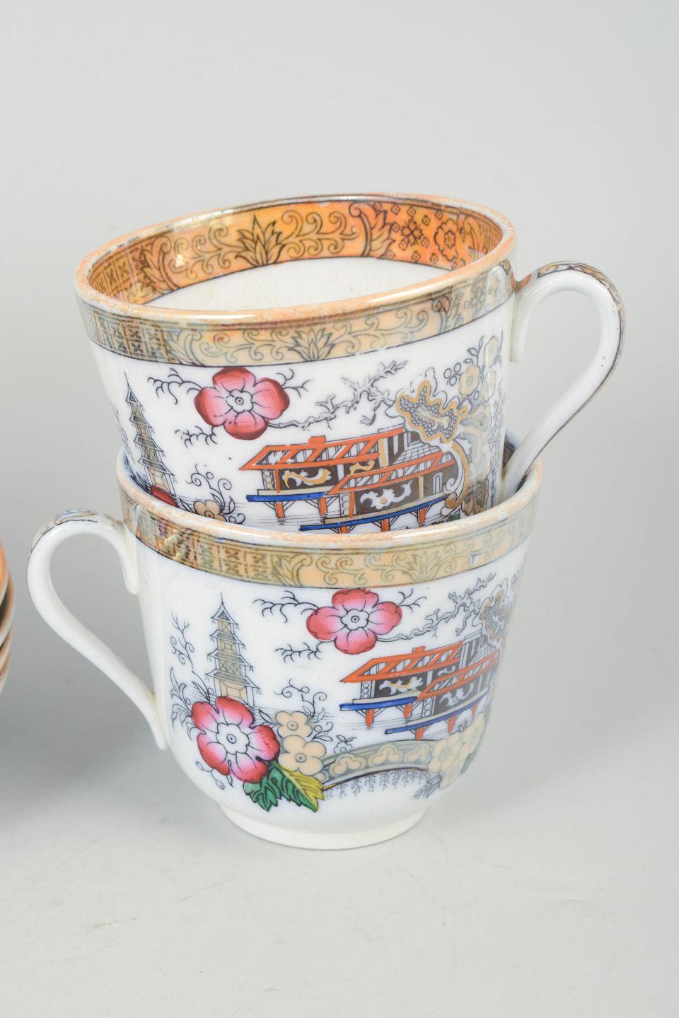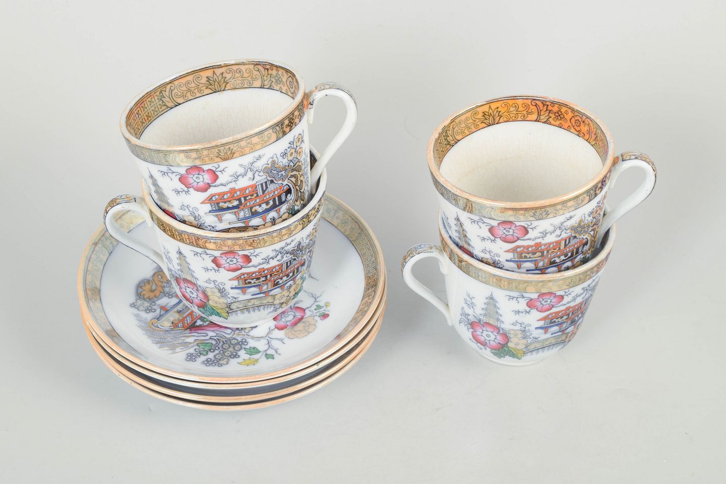 Rörstrand Japan, sæt af fire store kopper med underkopper.Store kopper i fajance med tilhørende underkopper, dekoreret i polykrom orientalistisk japansk stil med pagodemotiv, bygninger, fugl og blomster. Model Japan, produceret i perioden 1866–1925 og dateret til 1880’erne.