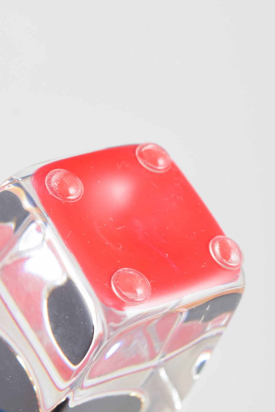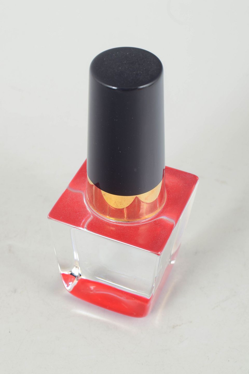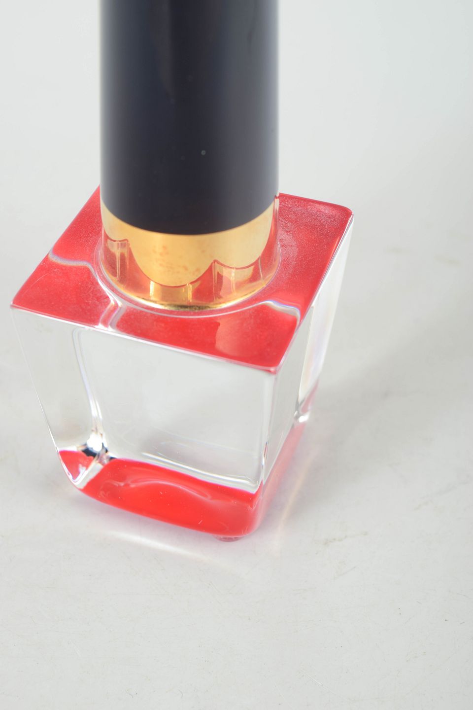 Åsa Jungnelius for Kosta Boda, glasskulptur i form af neglelak.Geometrisk formet glasskulptur i form af neglelak udført i klart og farvet glas med massiv kvadratisk base og cylindrisk top i mørk tone.