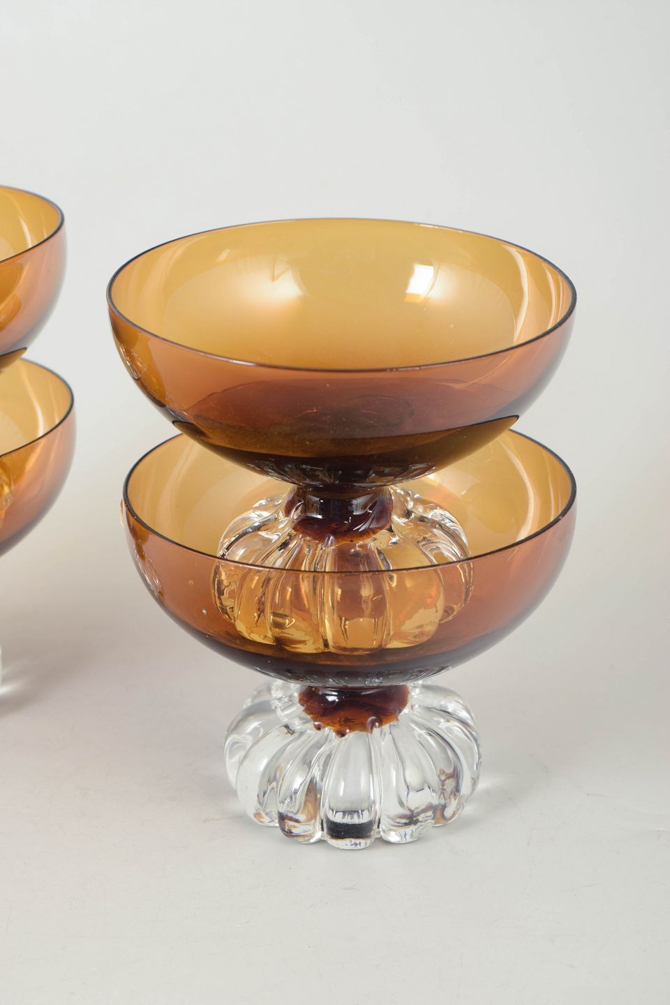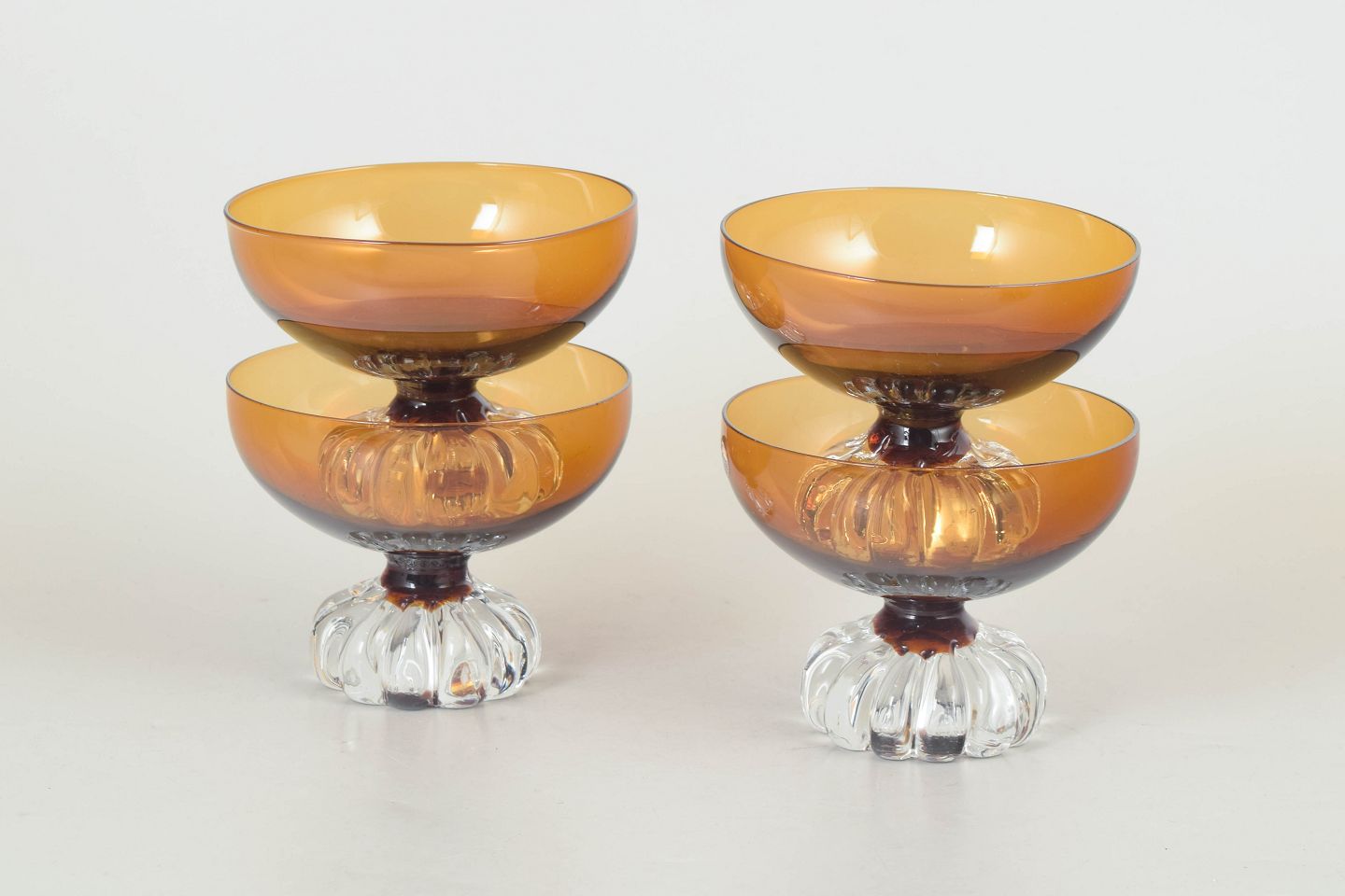 Bo Borgström for Åseda glasbruk, sæt af fire dessertskåle.Elegante dessertskåle i mundblæst glas med ravfarvet kumme og dekorativ fod i klart glas med rillet struktur, typisk for svensk glasdesign fra perioden.