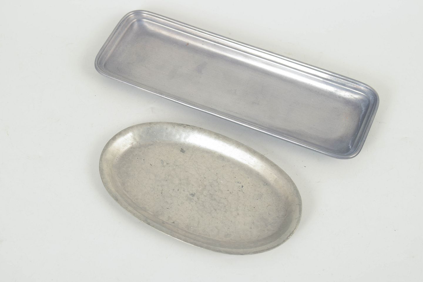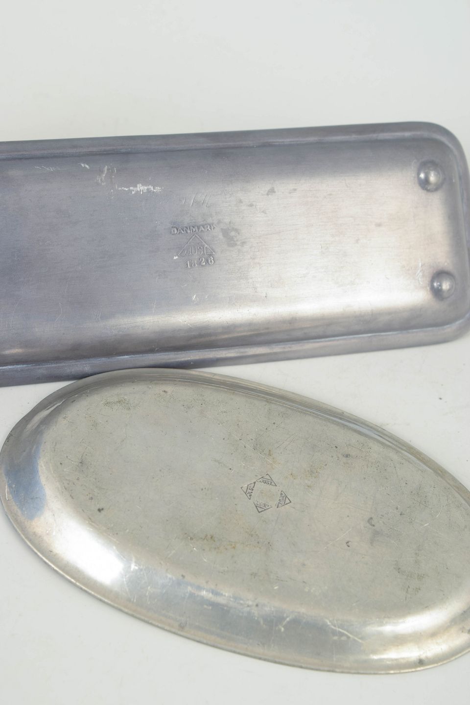 Just Andersen, to fade i tin.To elegante fade i tin, model 1826, udført i enkle og funktionelle former med let opadbøjede kanter. Klassisk dansk design fra mellemkrigstiden med en diskret patineret overflade.