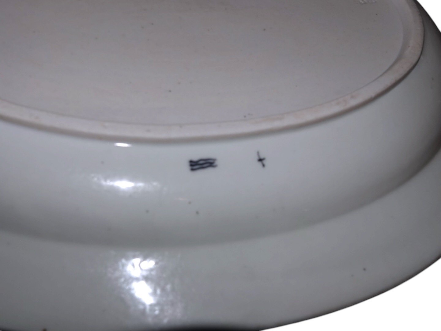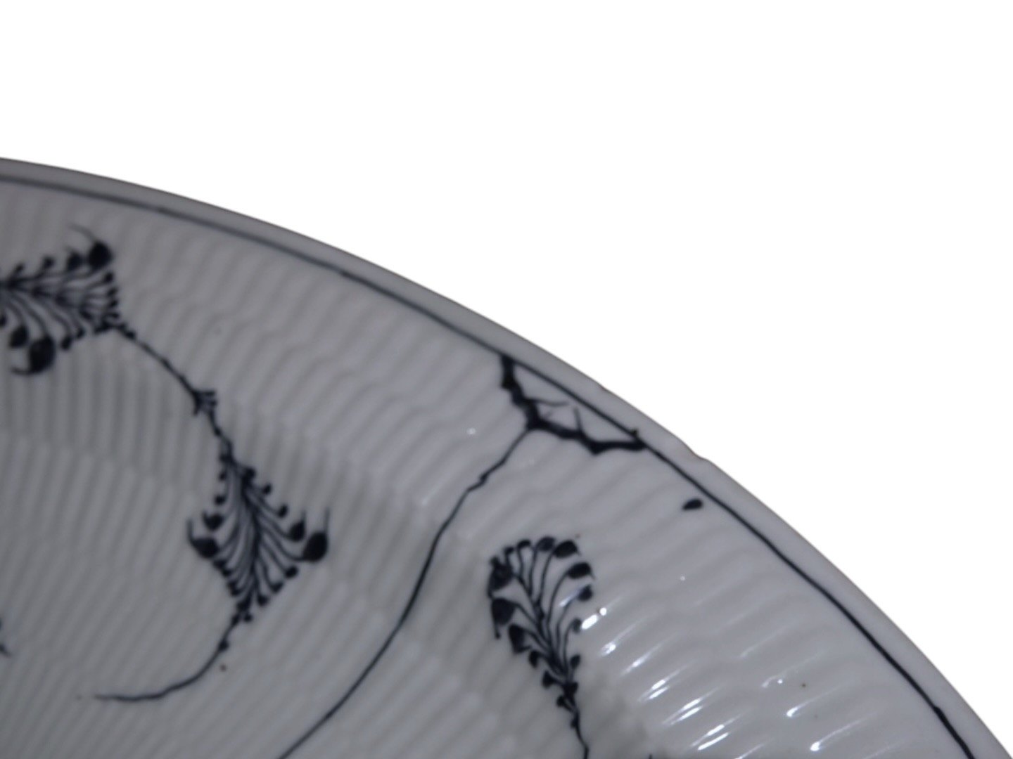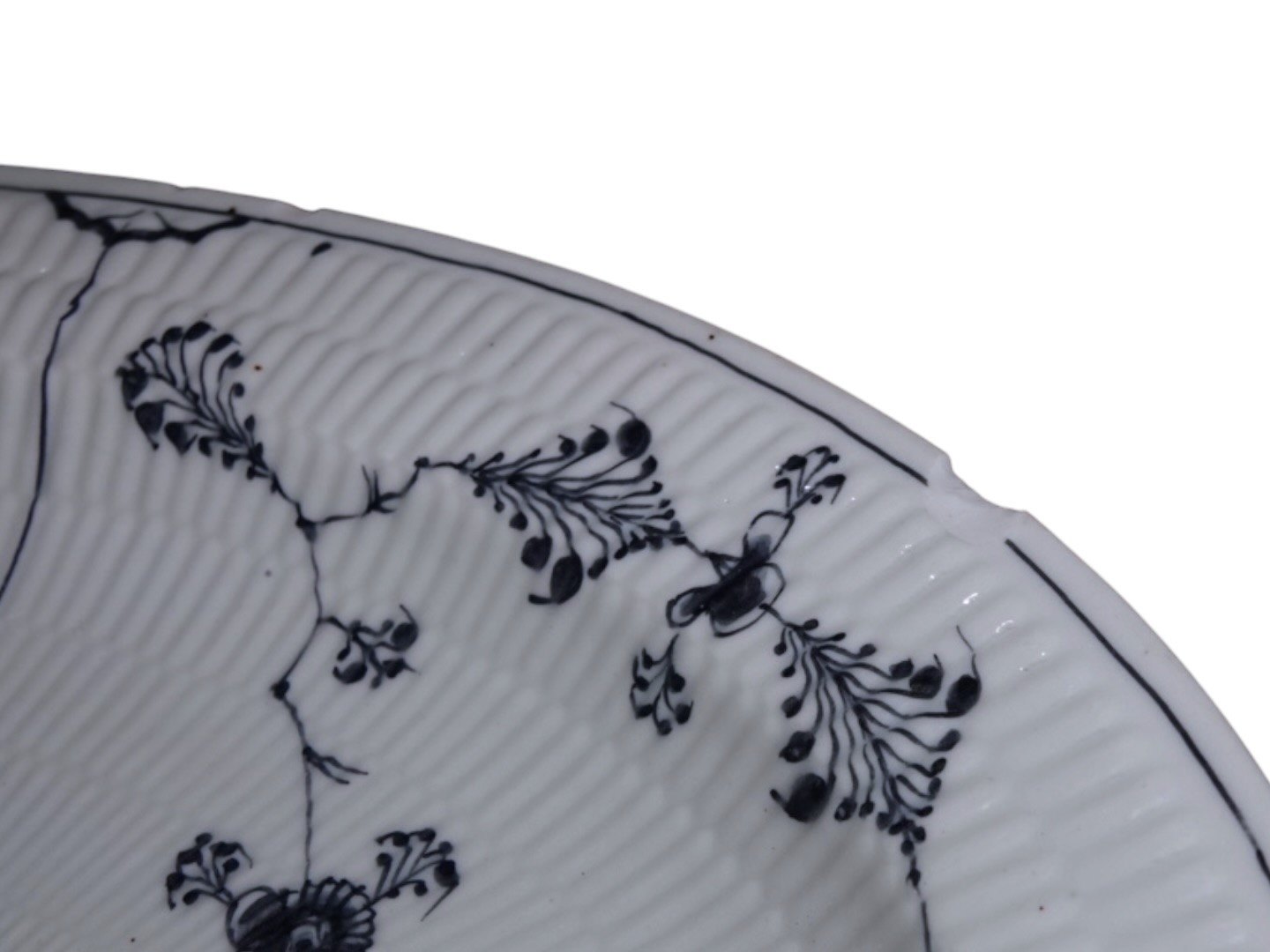 Royal Copenhagen Musselmalet Riflet, stegefad i gråt porcelæn.Fabriksmærket viser, at denne er produceret omkring 1790 til 1810.