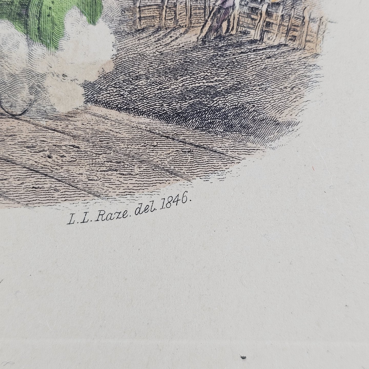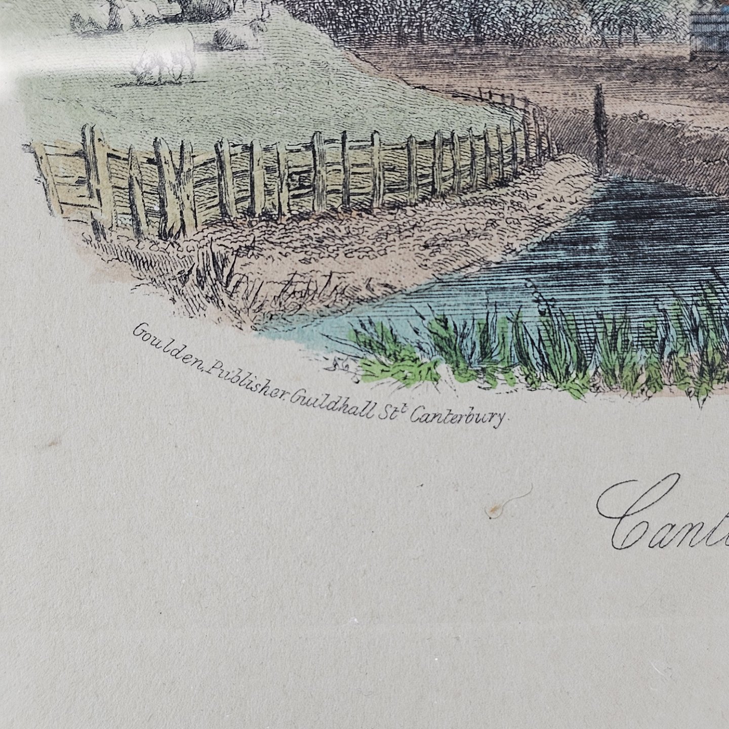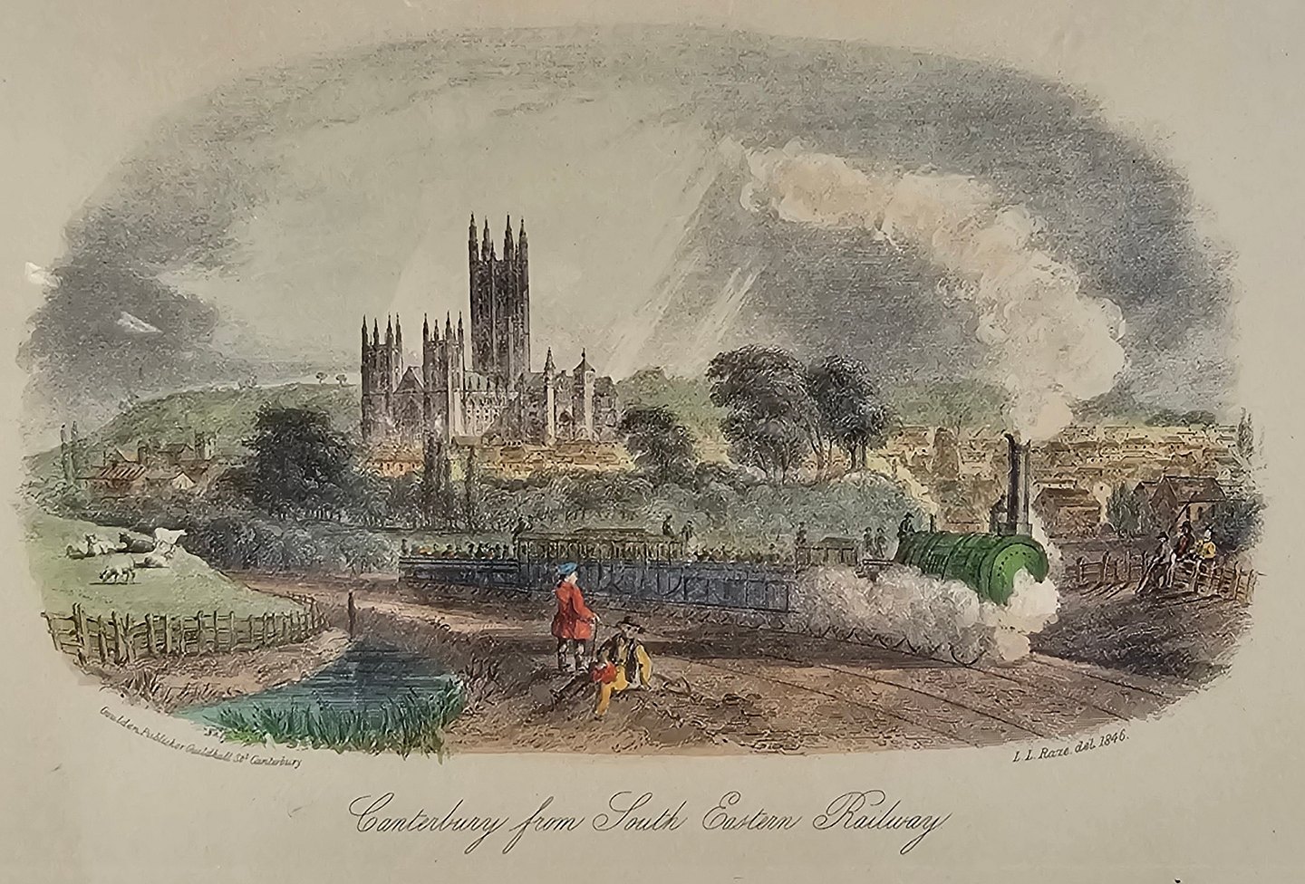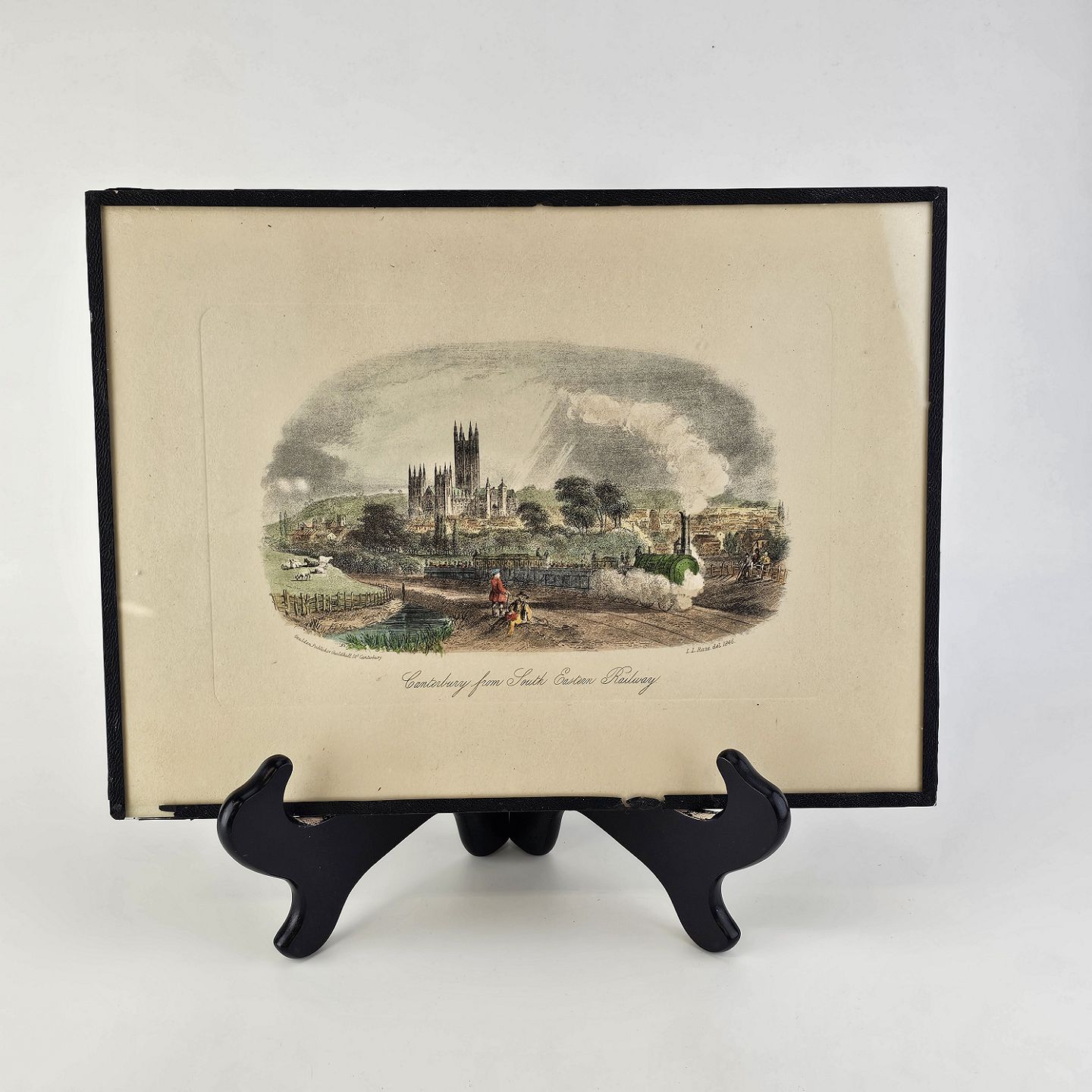 Bogryk på papir med motiv af Canterbury by fra den sydøstlige jernbane, monteret i sort rammeKunstner Louis Laurent Raze (1805-1872)