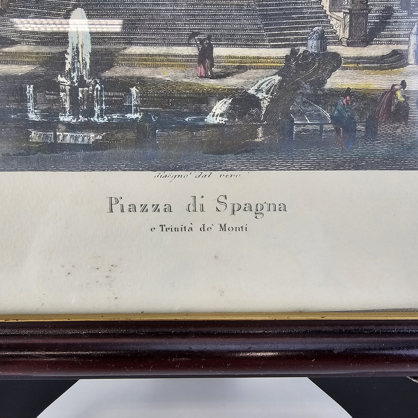 Bogtryk på papir med motiv af Piazza di Spagna i Rom, monteret i sort rammeKunstner Domenico Amici (1808-1871)