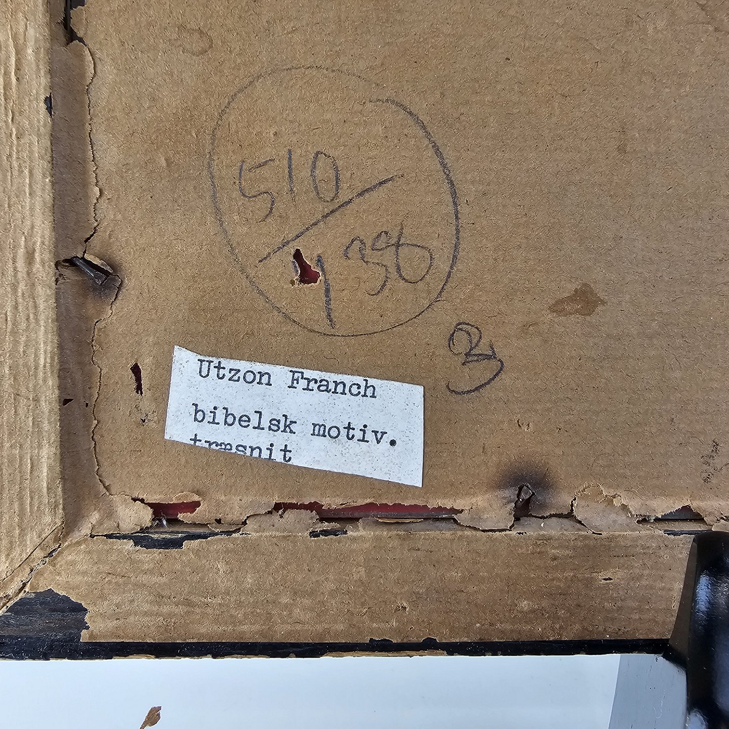 Trykt træsnit med bibelsk motiv, monteret i træramme og dateret 1932Kunstner Einar Utzon-Frank (1888-1955), signeret